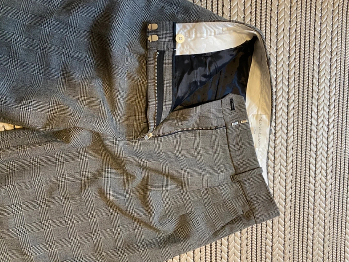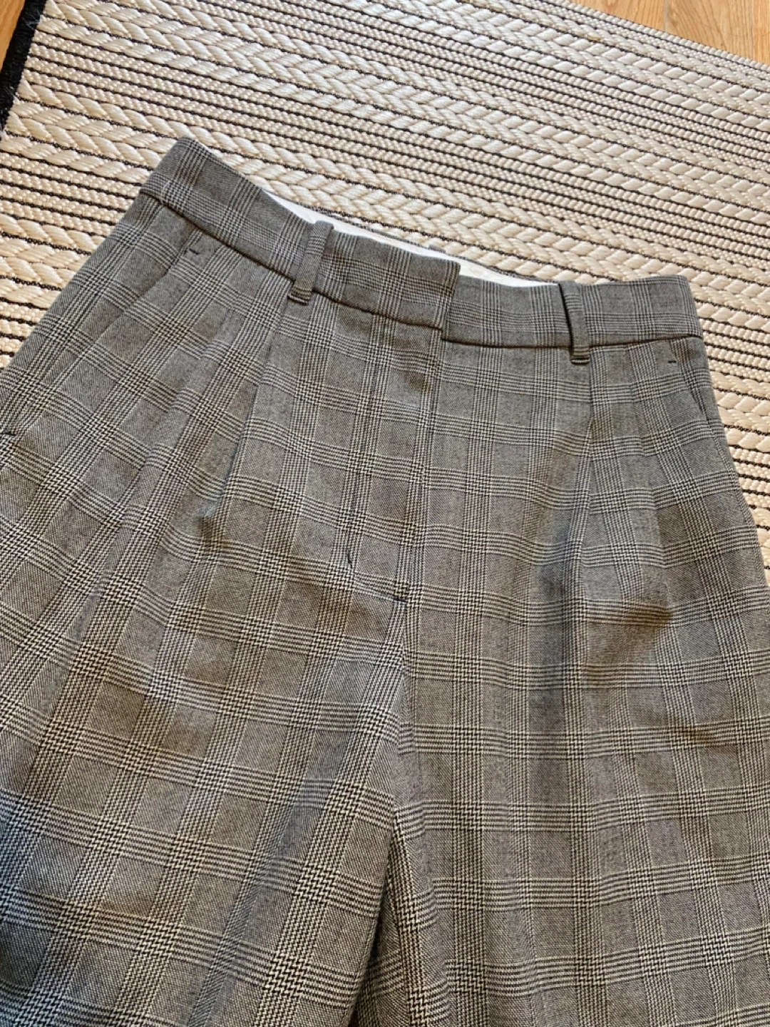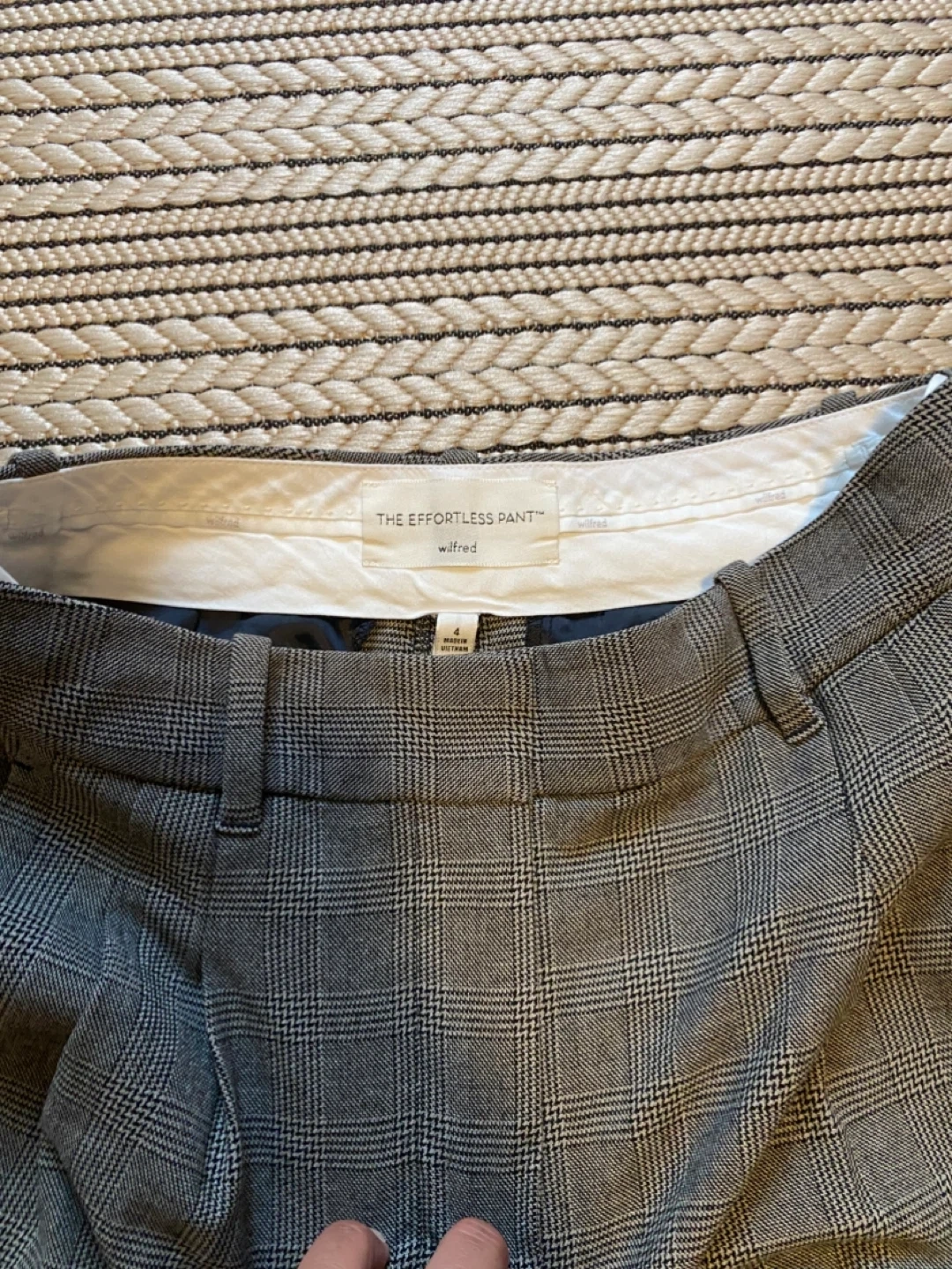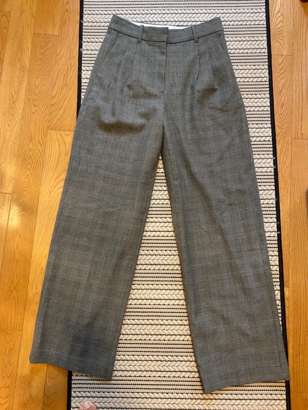 Selling a pair of Wilfred The Effortless Pants in size 4. They're in great condition and feature a stylish grey plaid pattern. Perfect for a chic and comfortable look!