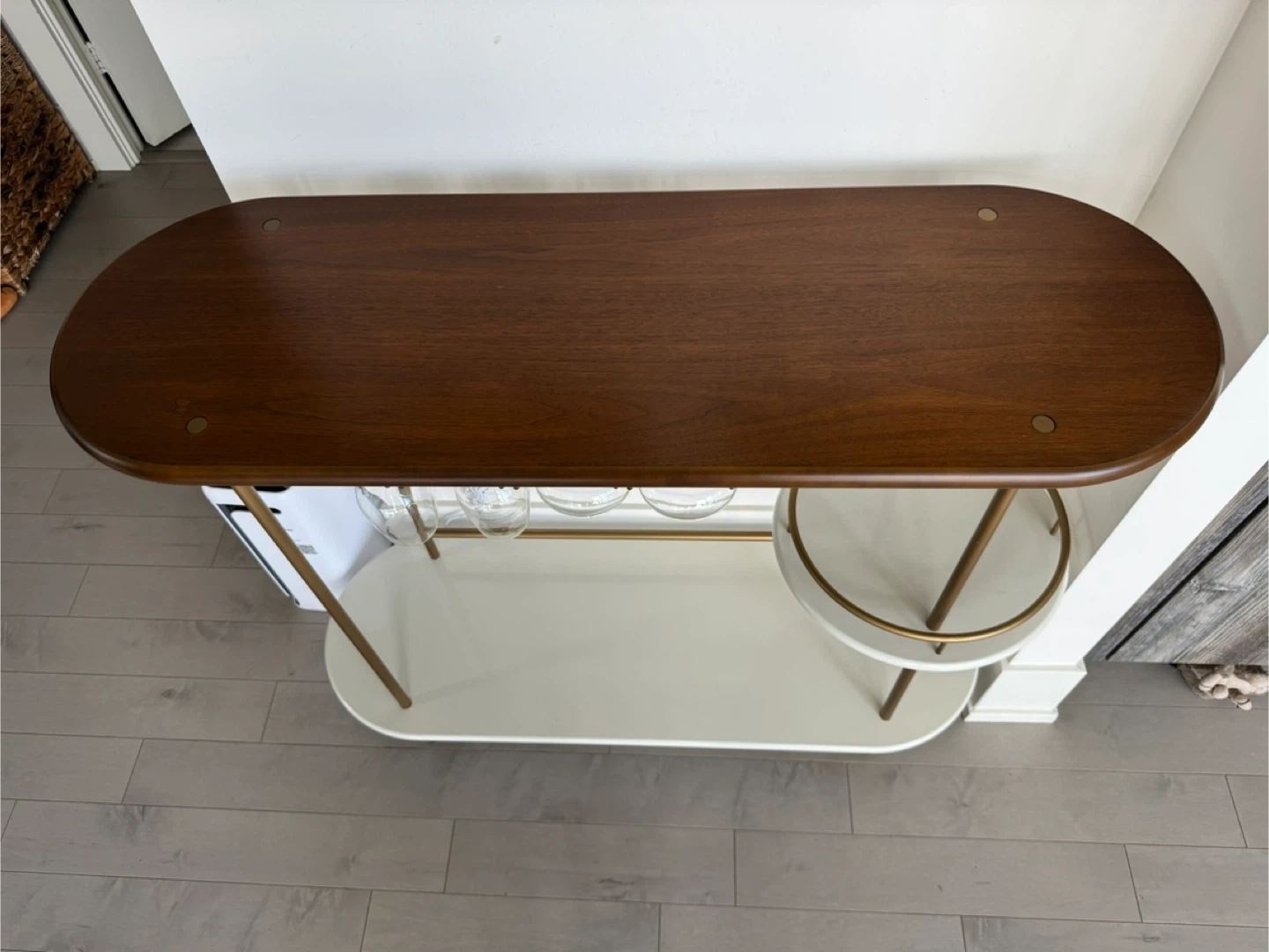 Selling a Williams Sonoma tiered bar console! It features a wood top, gold-tone frame, and a white lower shelf. The dimensions are 1067 x 356 x 864mm. Perfect for entertaining or adding a touch of elegance to your space. Here is the listing on west elm for more details: https://www.westelm.ca/products/tiered-bar-console-h2419/?catalogId=71&sku=5610329&cm_ven=PLA&cm_cat=Google&cm_pla=Furniture%20%3E%20Bar%20%26%20Kitchen%20Furniture&cm_ite=5610329_13539753036&gad_source=1&gad_campaignid=13539753036&gbraid=0AAAAAC06p2CCgMwmE26cy9SFgfoPJcsmw&gclid=EAIaIQobChMI1azLxLf5jwMVZTcIBR14QhomEAQYAiABEgK0O_D_BwE