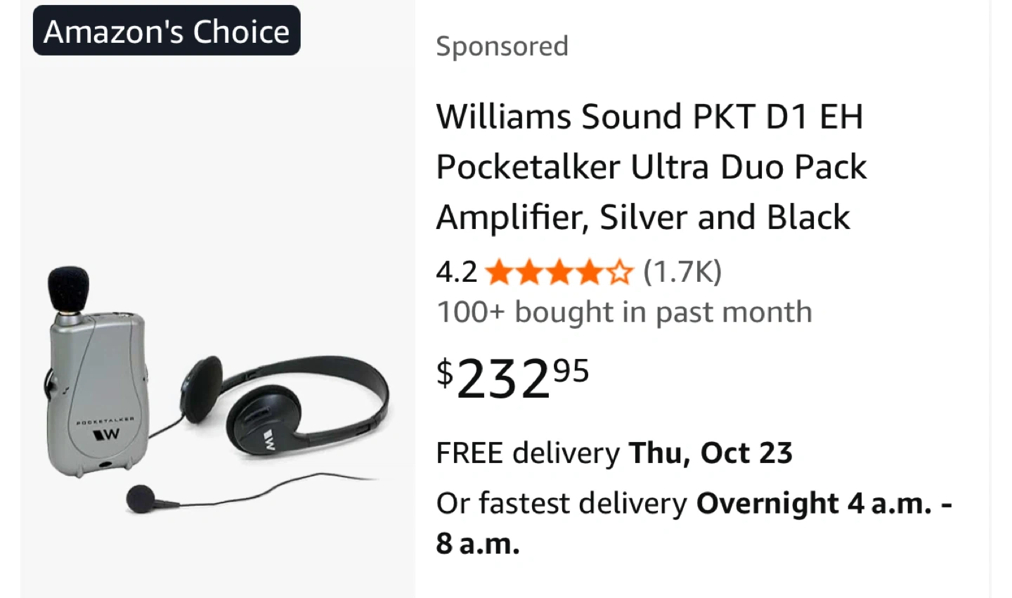 144I'm selling a Williams Sound Pocketalker Ultra Duo Pack Amplifier! This device is designed to improve speech understanding with its powerful sound amplification. It features a portable and sleek compact design, making it easy to take with you anywhere you go. It also includes (2) AAA batteries for 200 hours of operation