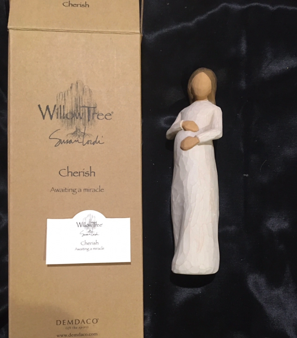This Willow Tree 'Cherish' figurine is in brand new condition and comes with its original box. The figurine depicts a pregnant woman, making it a thoughtful gift for expecting mothers. It's a beautiful piece to celebrate the miracle of life. If the ad is up, it's available! Don't miss out on this precious piece—it's waiting to find a new home to be cherished in! Thanks and please see my other ads!