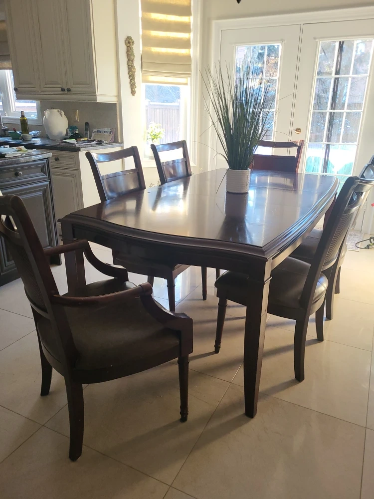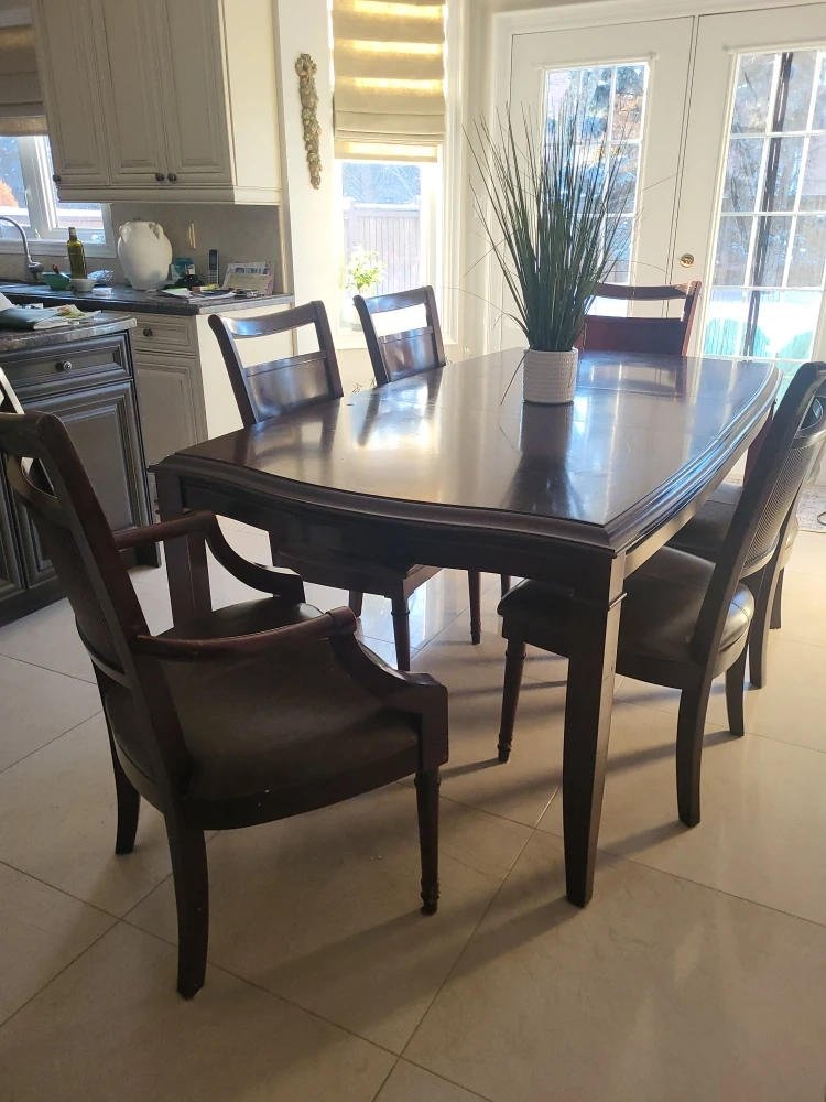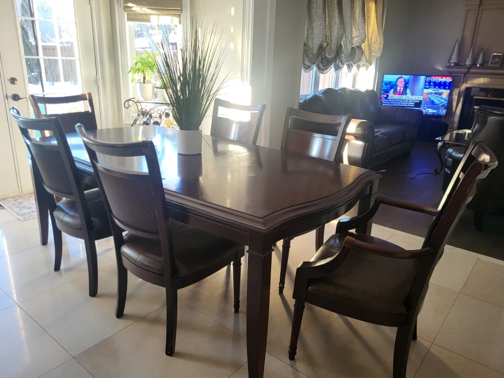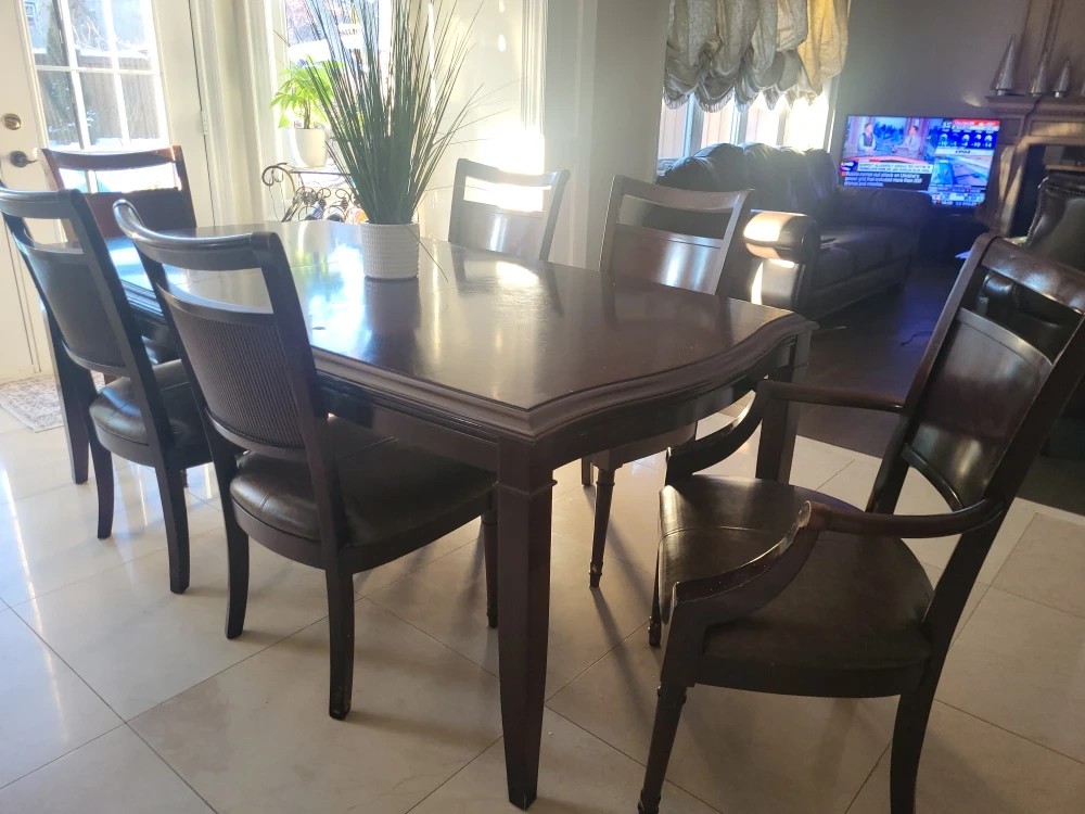 This is a rich, dark wood dining set that includes a table and seven matching chairs.(one is a armchair) The chairs feature comfortable leather seats and a textured backrest. It's a classic design that'll fit most dining rooms!