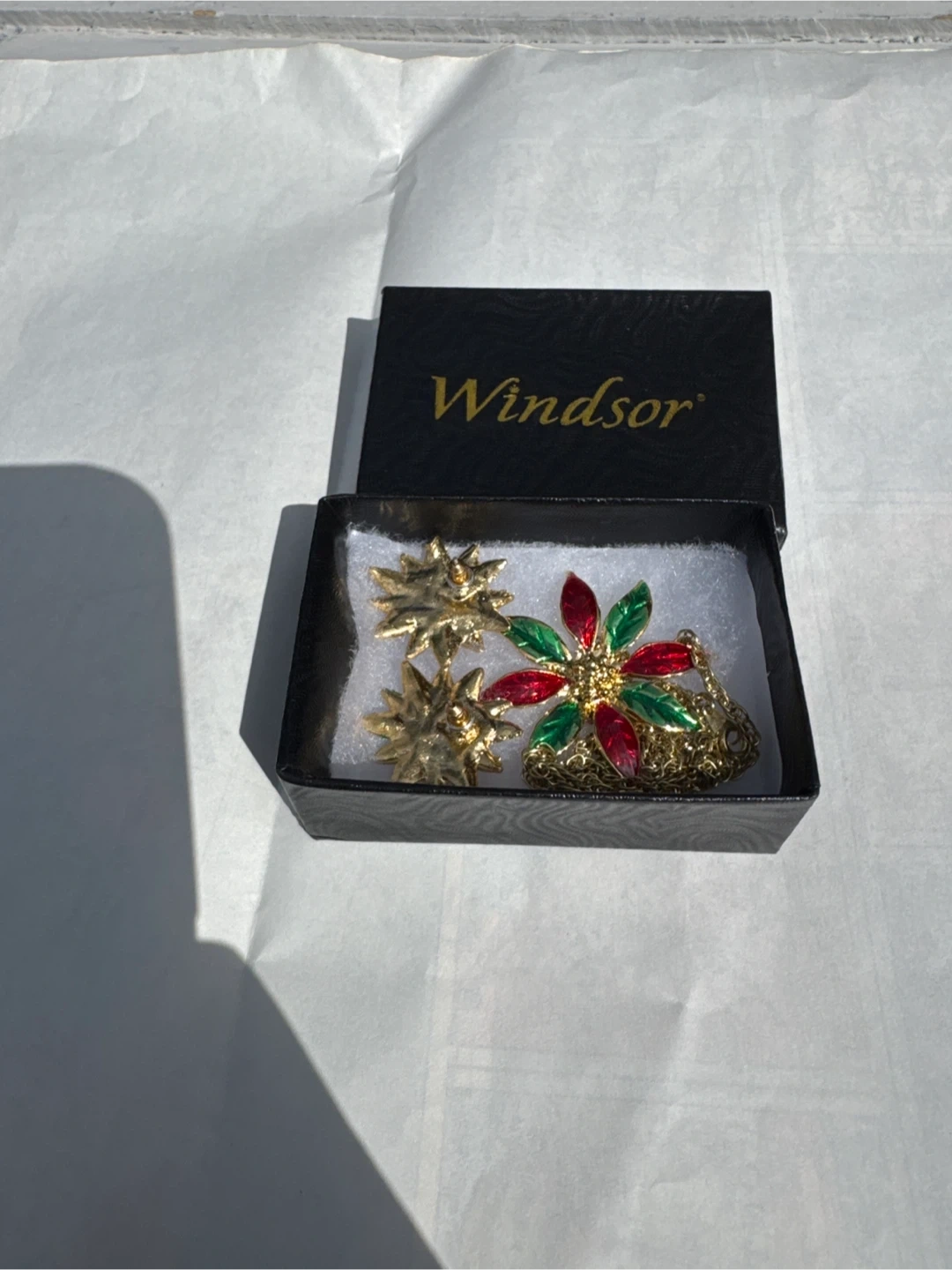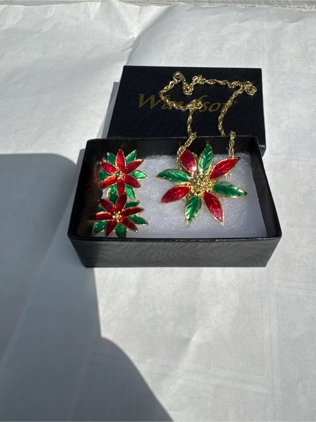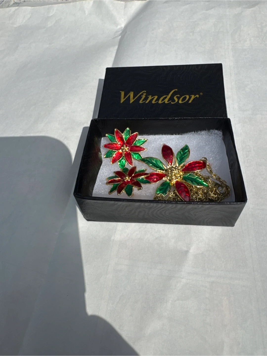 Selling a beautiful Windsor Christmas necklace and earring set. It comes with the original box. The set includes a necklace and a pair of earrings with a festive poinsettia design in red, green, and gold tones. Perfect for adding a touch of holiday cheer to your outfit