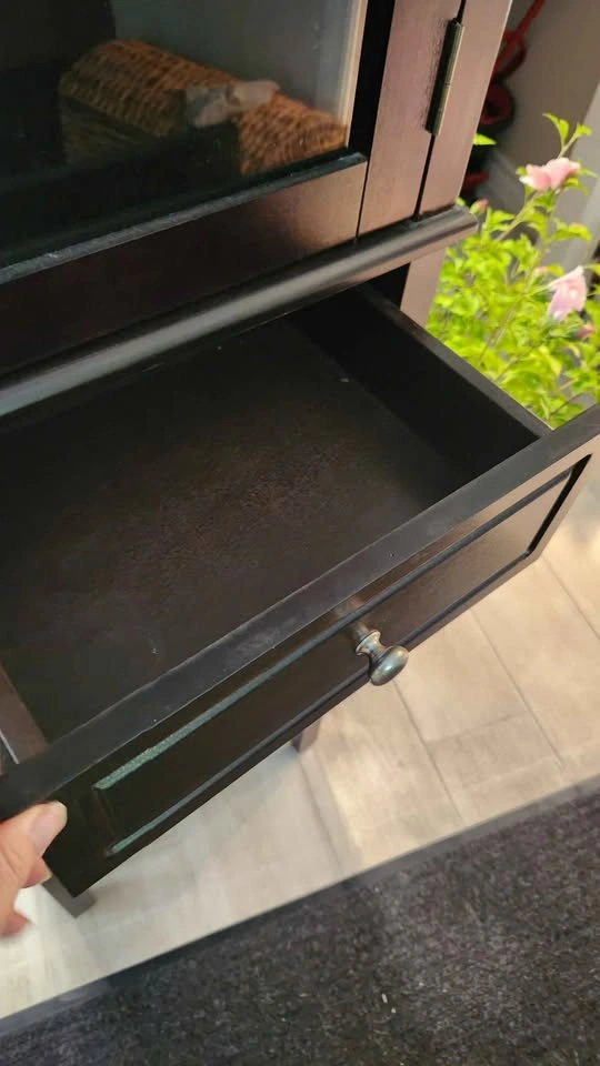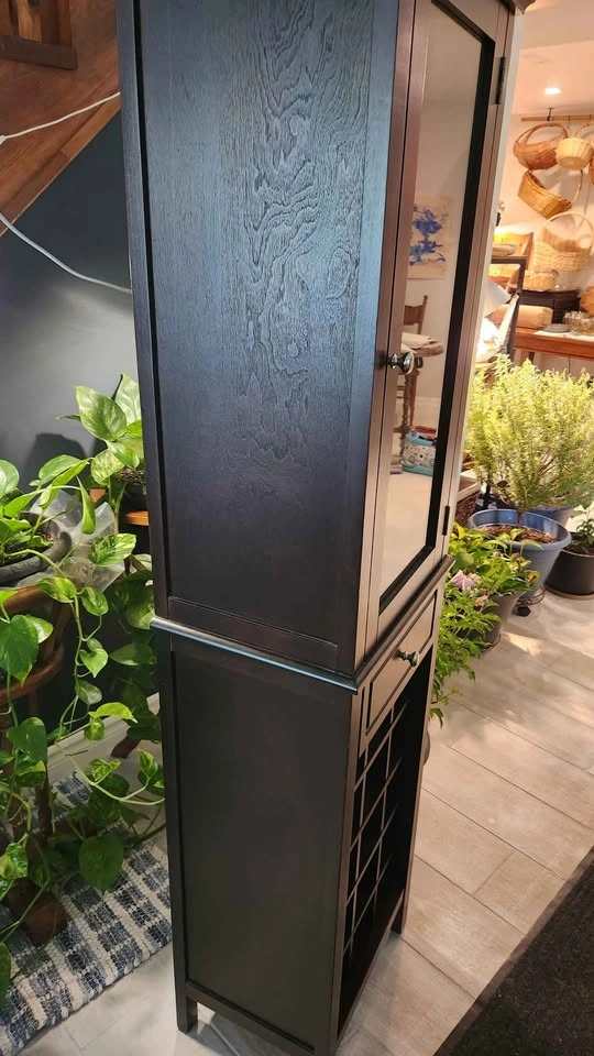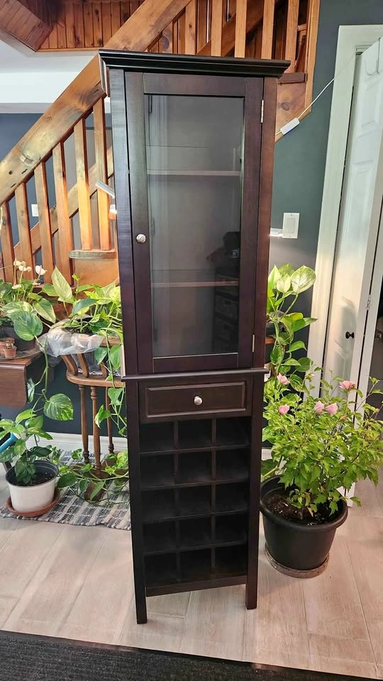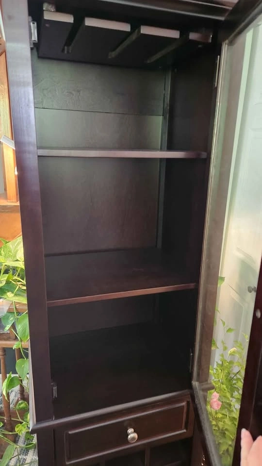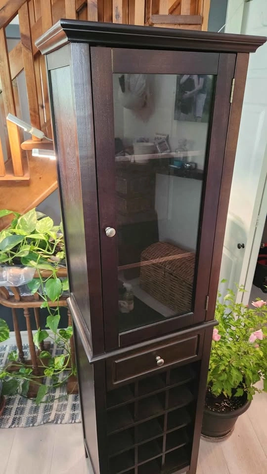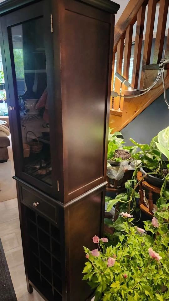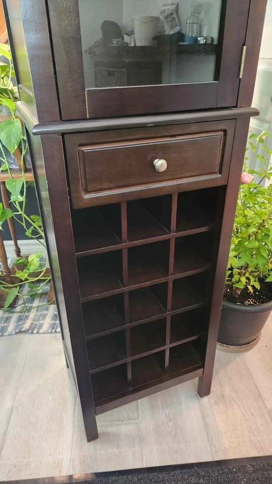 Beautiful dark brown wine cabinet. Display section with hanging rack for hanging stemmed wine glasses, shelves for stemless and other glasses, bottom section holds 15 bottles, plus the draw for bottle openers and accessories. It's excellent condition, looks brand new. We recently moved and no longer have space for it. Pickup in Lisle.