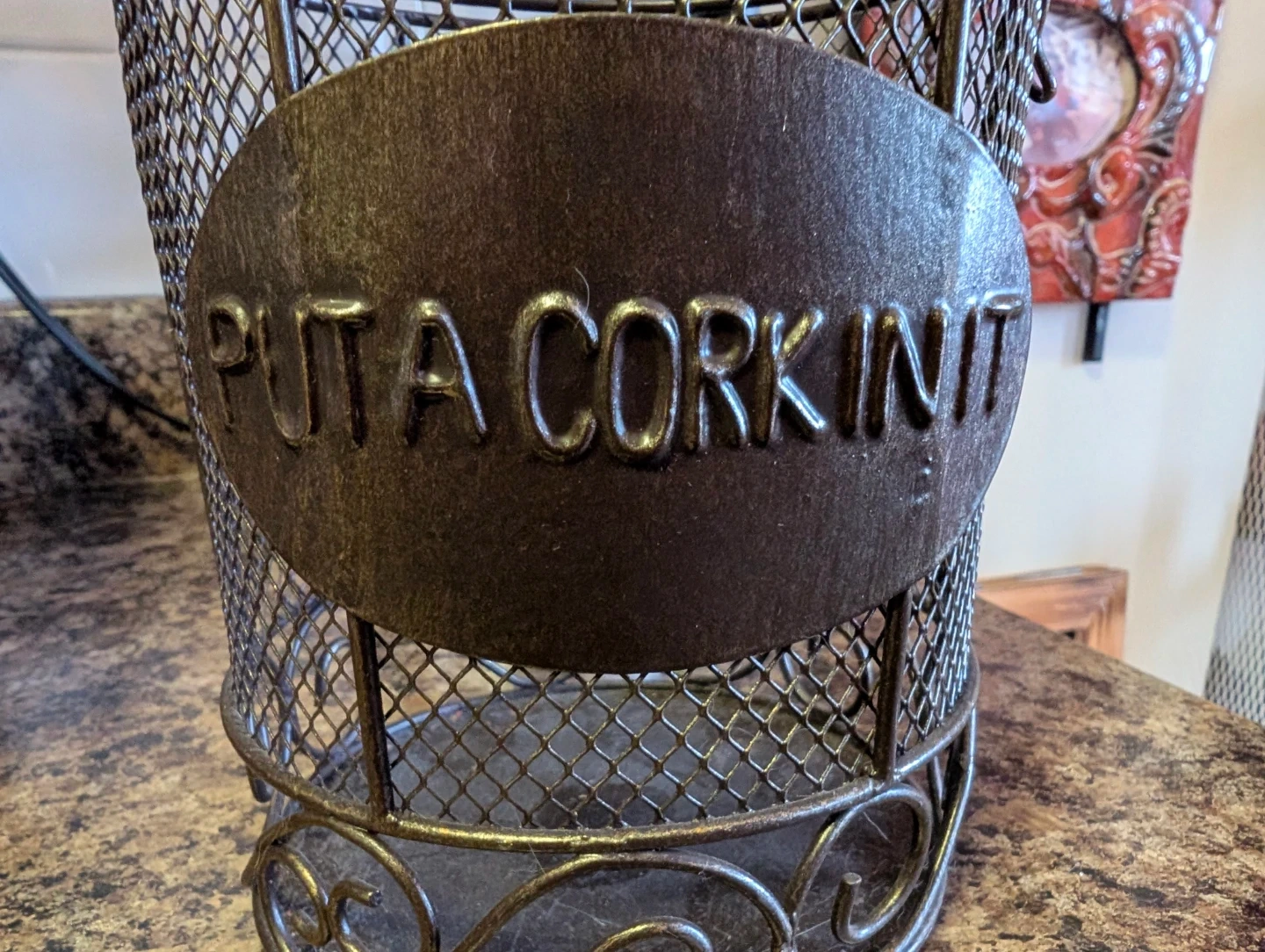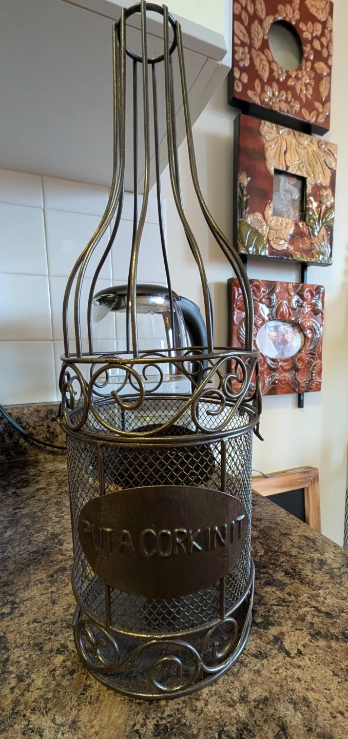 90A decorative metal wine bottle/cork holder. It has a rustic look and features the phrase "Put A Cork In It". A fun piece for any wine lover's home! Cash only - pickup only