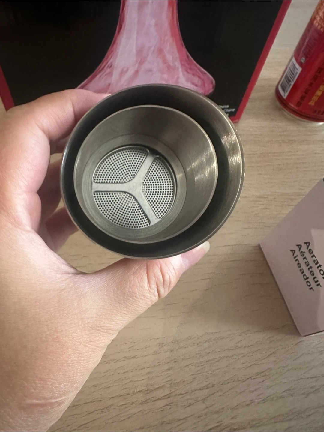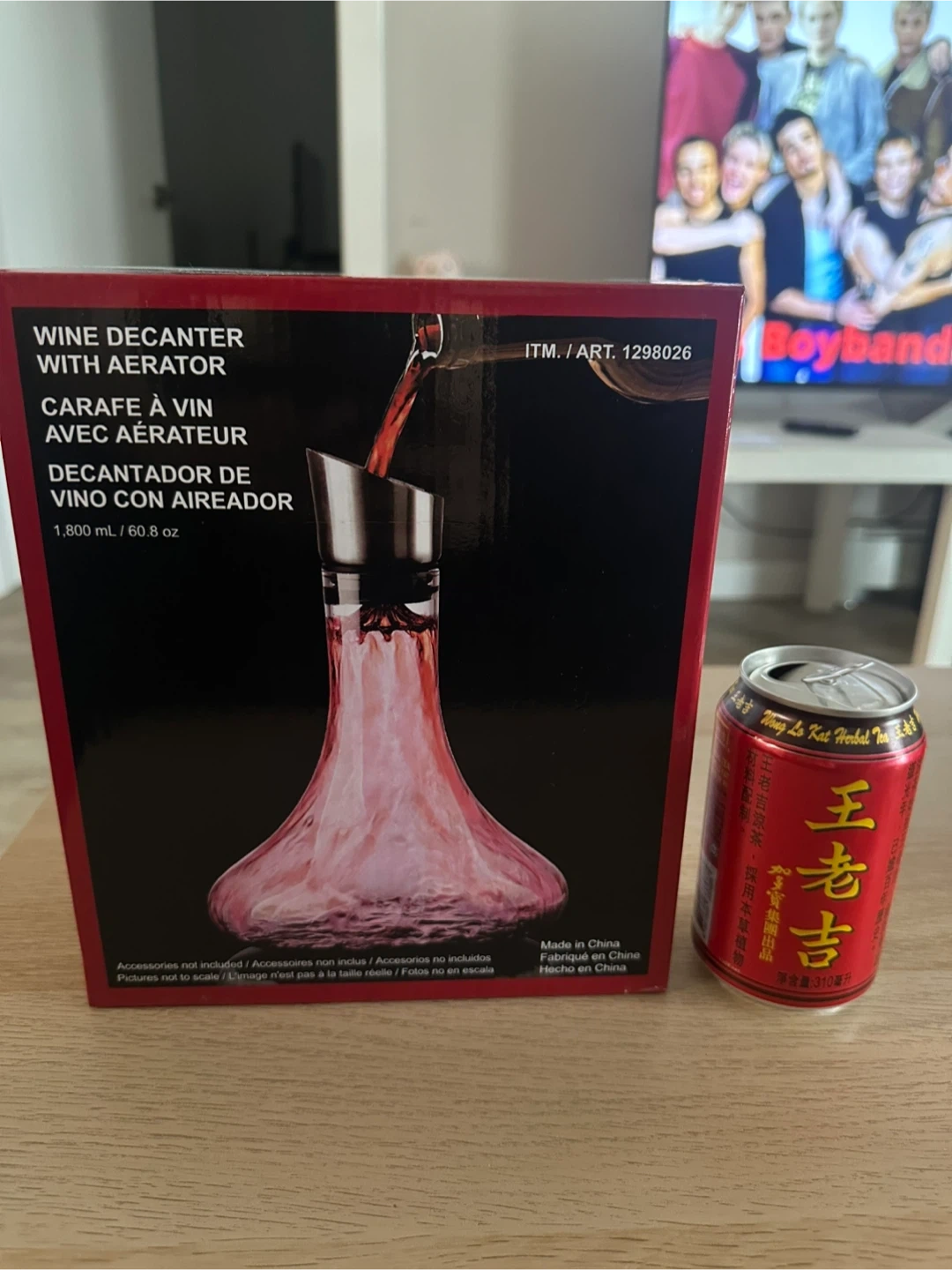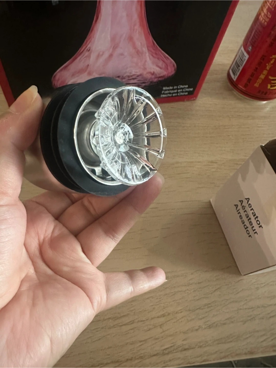 10Selling a brand new wine decanter with aerator, still in its original packaging! The box includes the decanter and aerator. It's a carafe à vin with a decantador de vino. Holds 1,800 mL / 60.8 oz (pop for sizing)