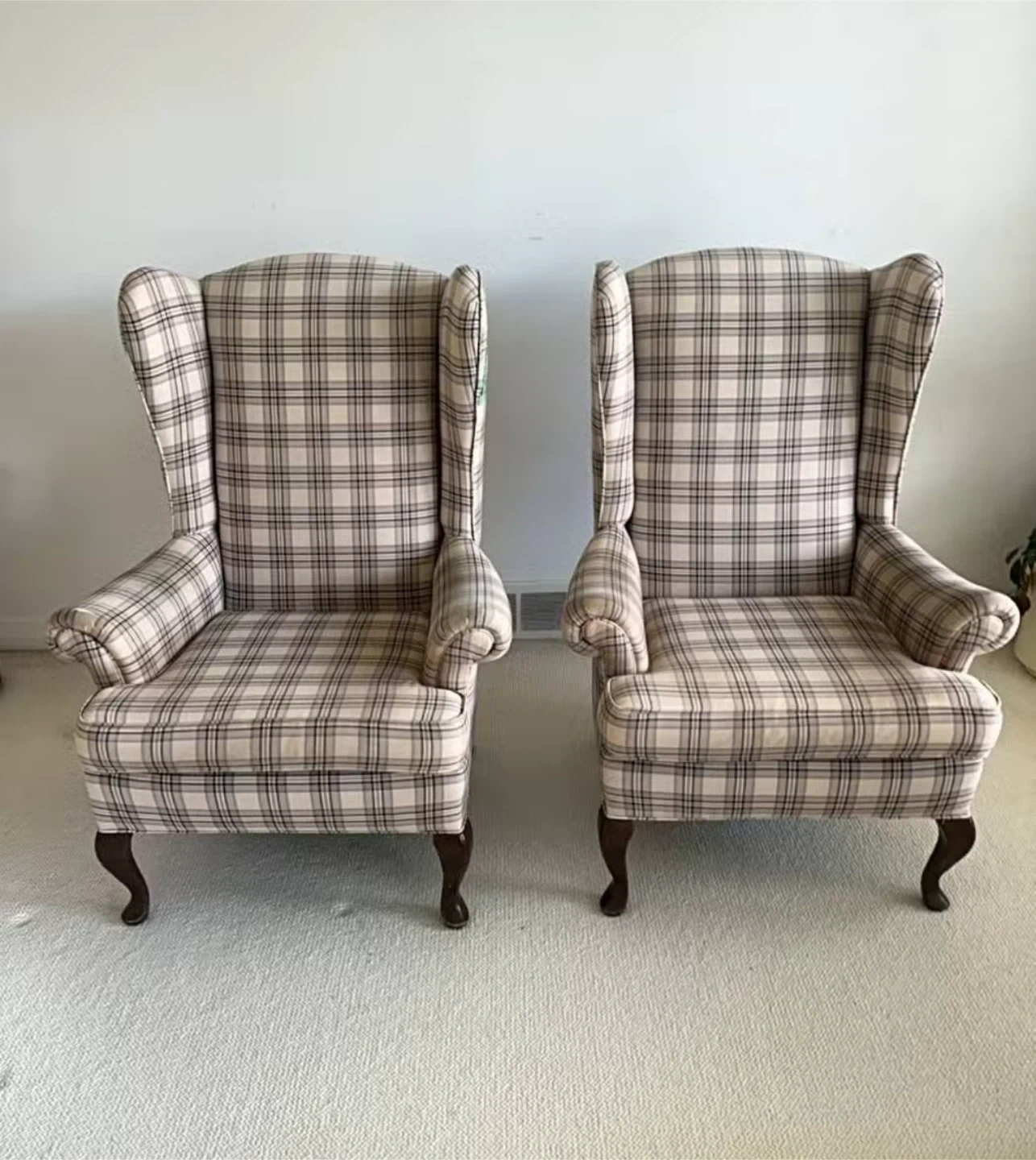 97Selling a pair of wingback accent chairs featuring a classic plaid pattern. They're in great shape and would look lovely in any living room or study. These chairs offer both style and comfort, perfect for relaxing with a book or adding a touch of elegance to your home decor
