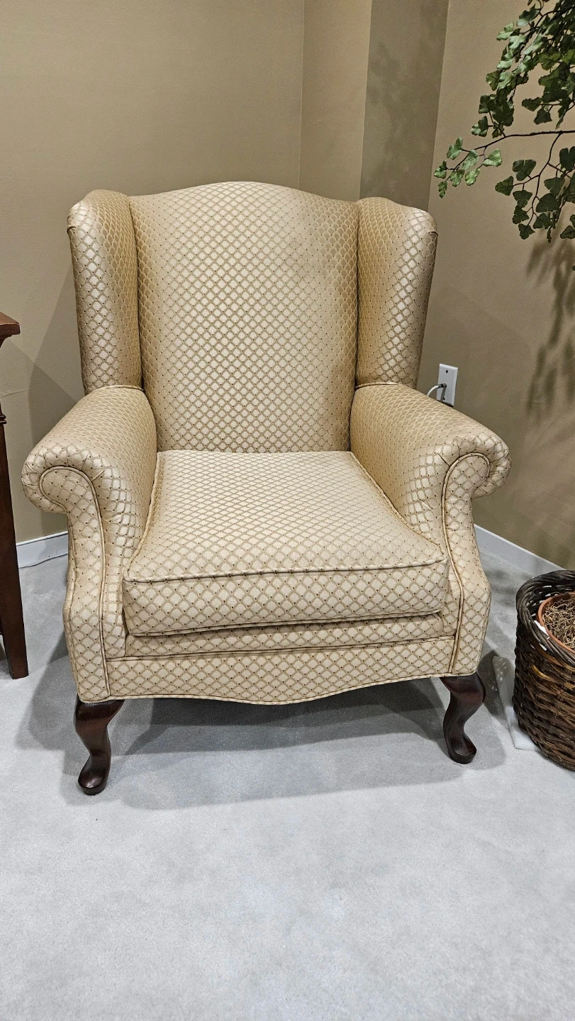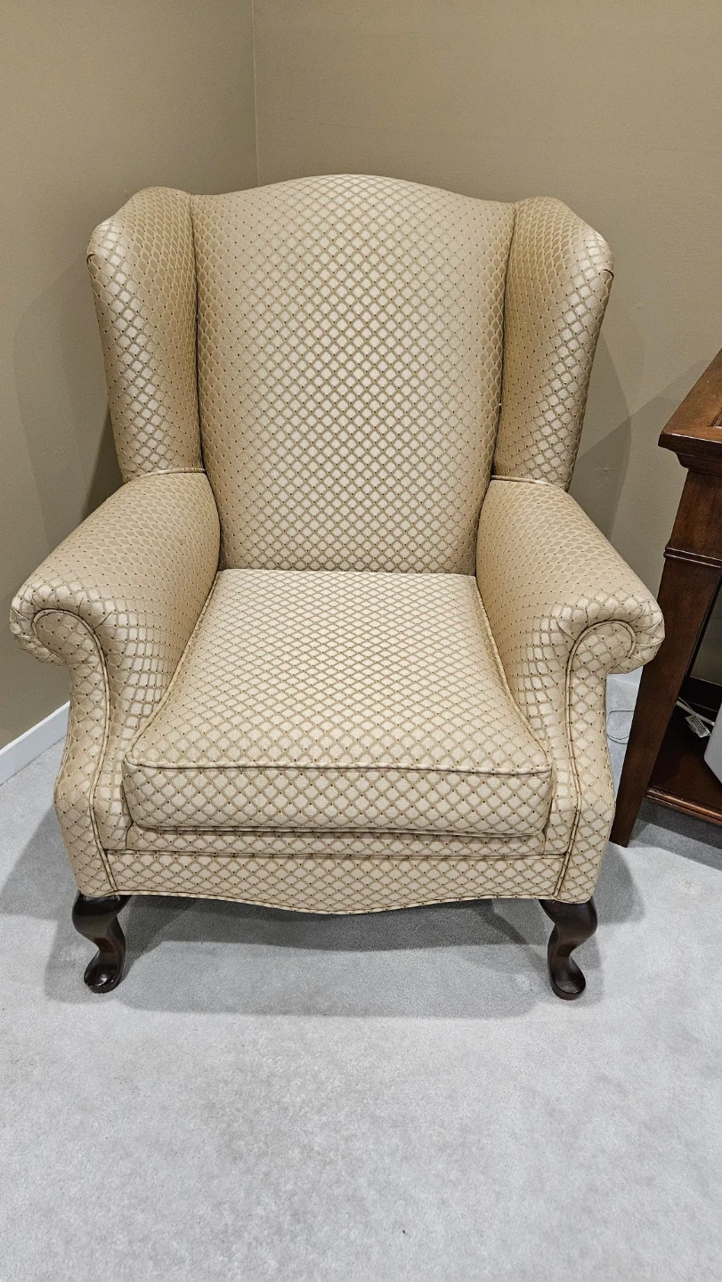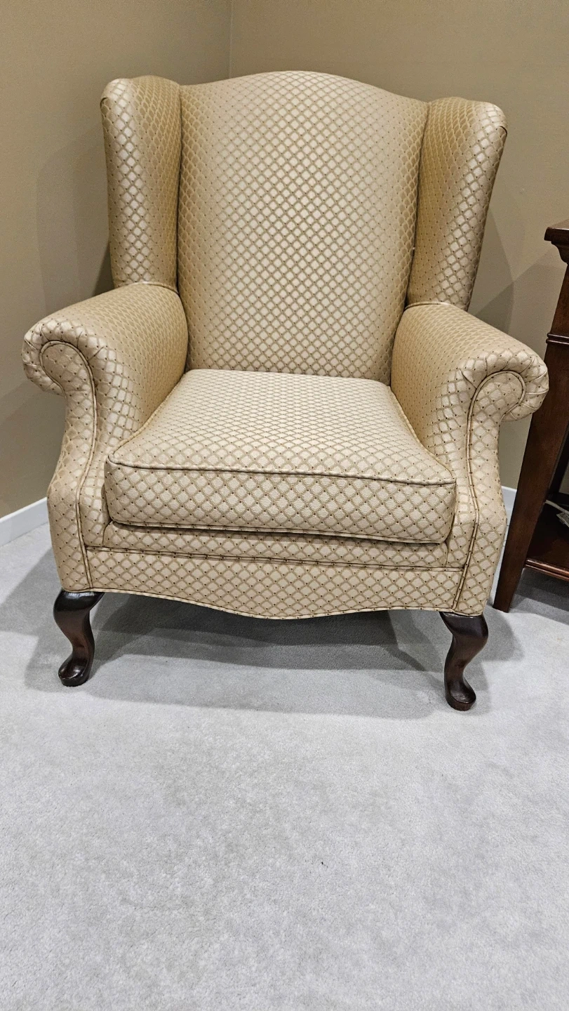 102 Comfortable wingback armchairs featuring a beige patterned fabric. Perfect for adding a touch of elegance to any room. The chair has a classic design with a high back and rolled arms. Middle console on the image is not included.