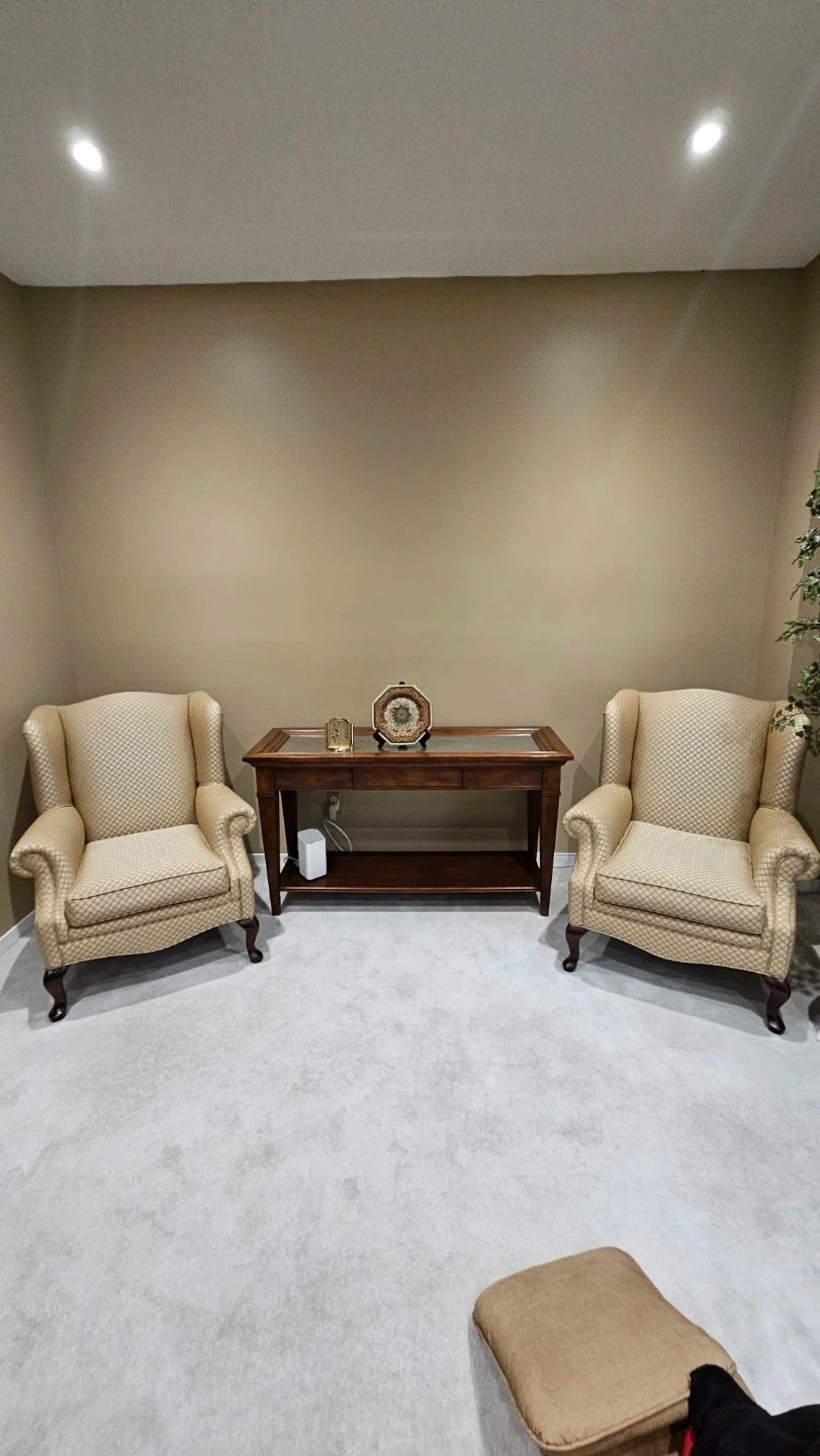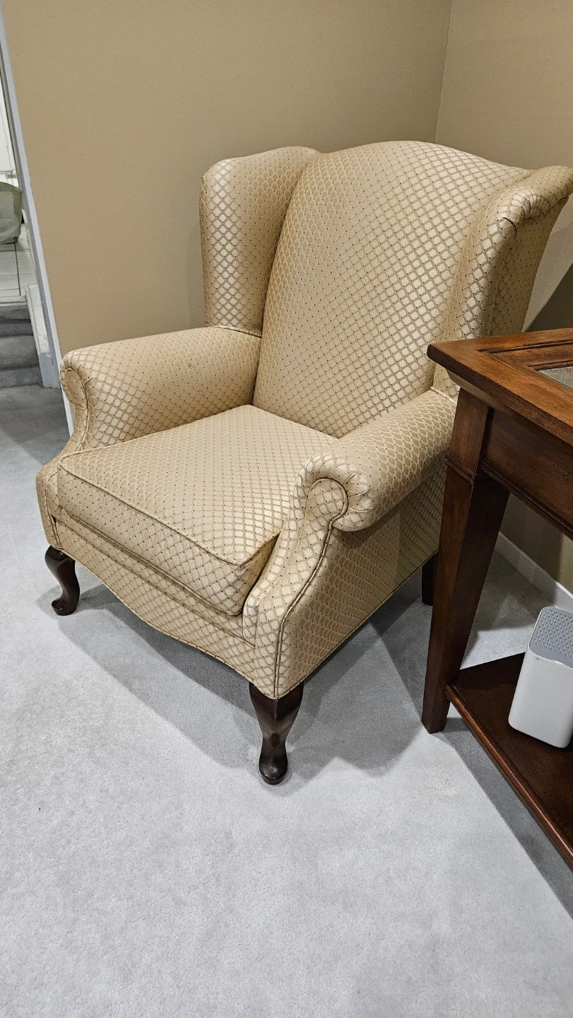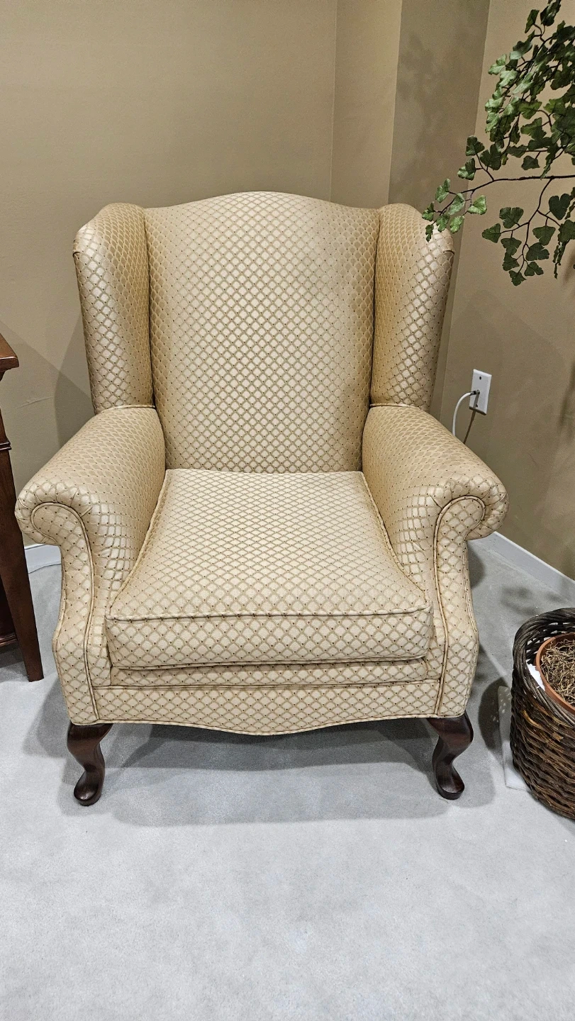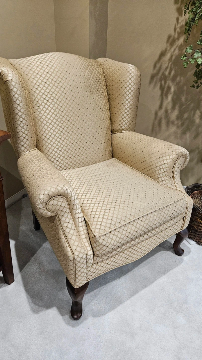 102 Comfortable wingback armchairs featuring a beige patterned fabric. Perfect for adding a touch of elegance to any room. The chair has a classic design with a high back and rolled arms. Middle console on the image is not included.