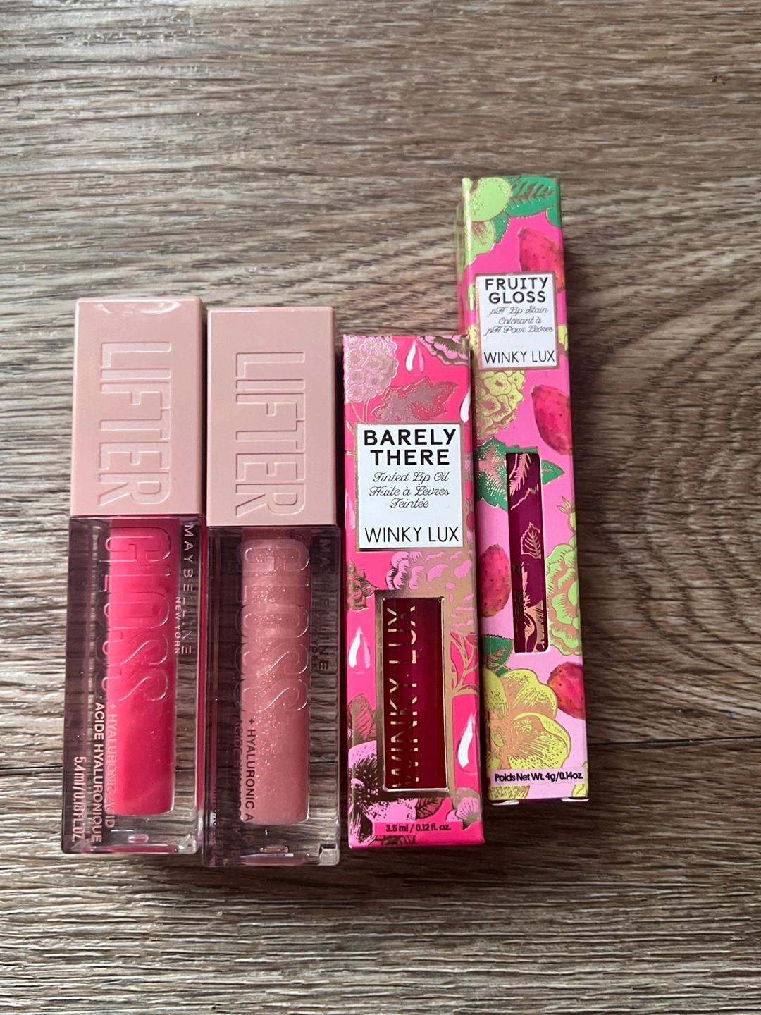 36never used lip glosses. Includes two Maybelline Lifter Gloss and two Winky Lux glosses: opal, bubblegum, luscious and prickly pear