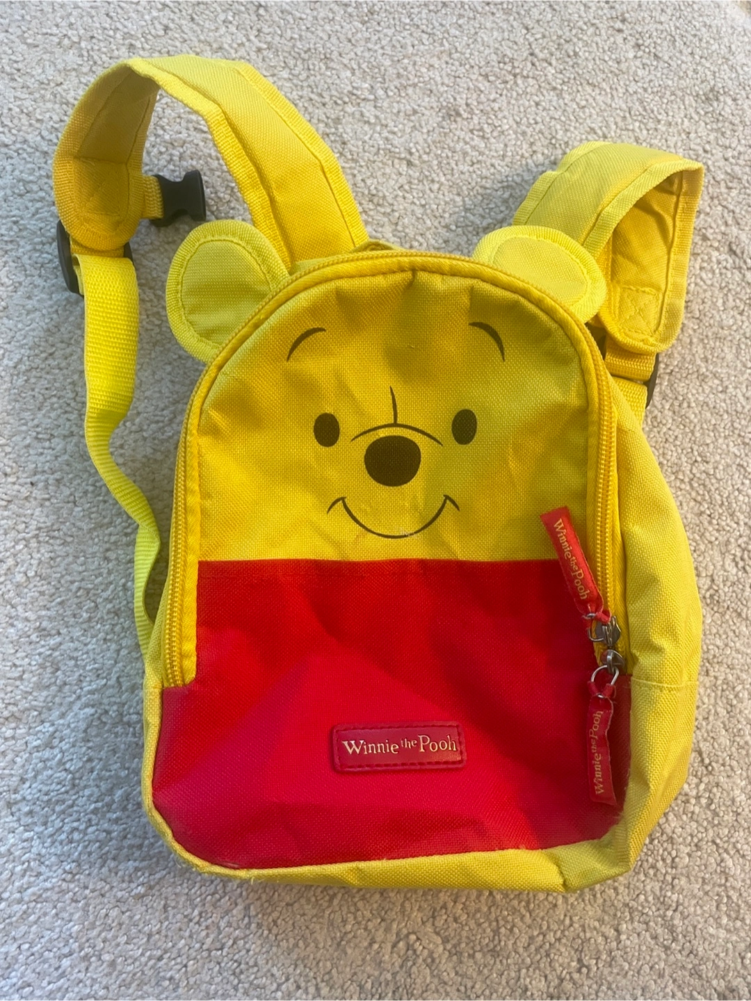 This Winnie the Pooh backpack is perfect for your little one! It's in great condition and features a cute Winnie the Pooh design in yellow and red. It's a great size for toddlers to carry their essentials