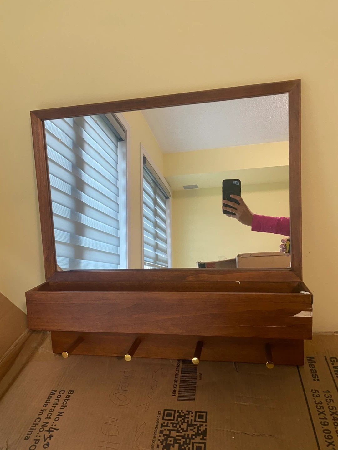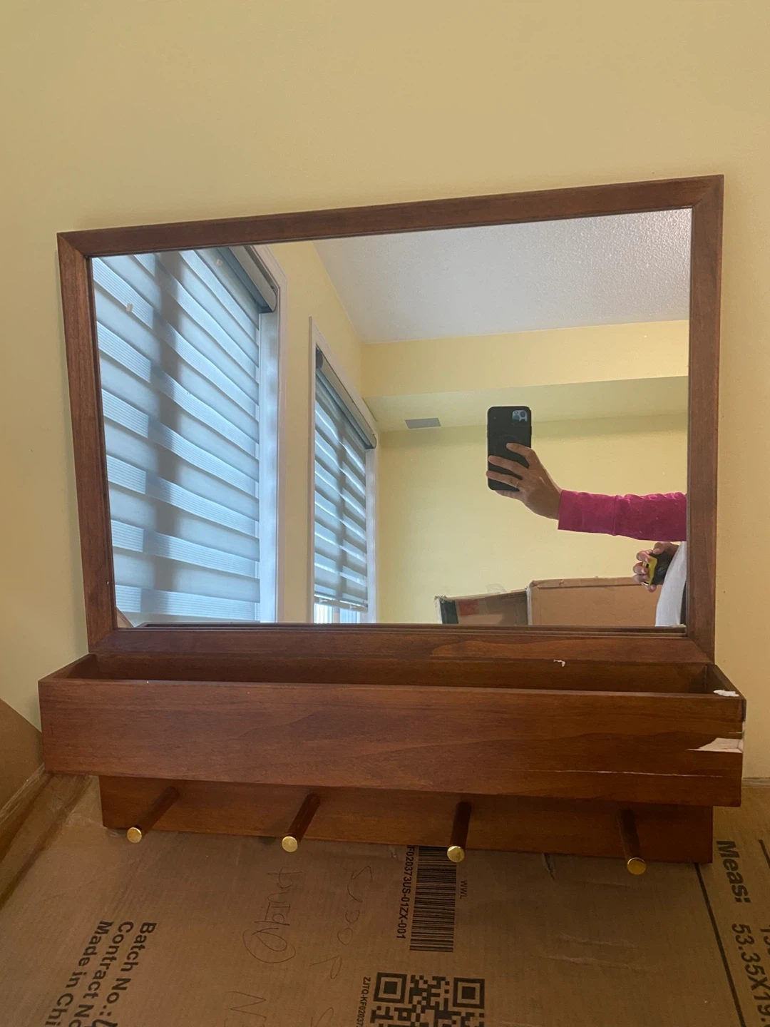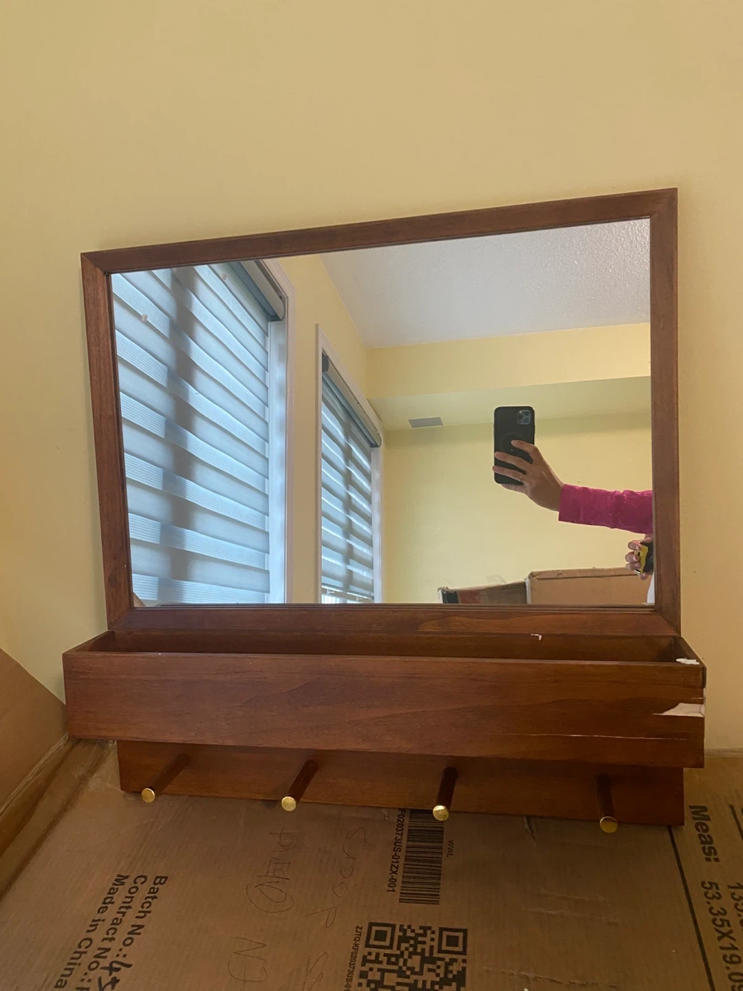 Selling a Winston Porter Jaela Wood Flat Mirror with Shelves. It's a stylish piece for any entryway or bedroom. This mirror features a flat design with a shelf and hooks, perfect for organizing your essentials. Originally bought for $252.99