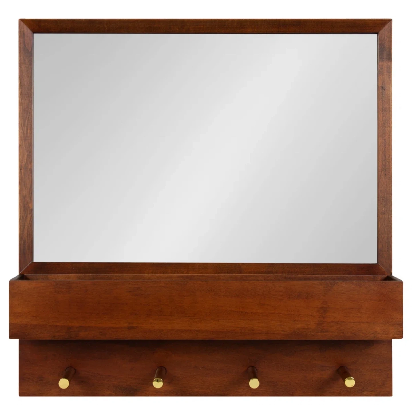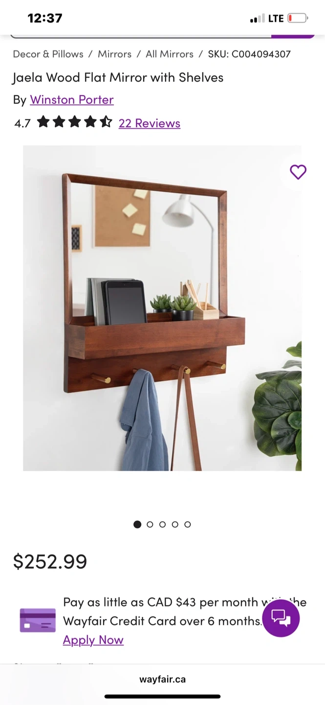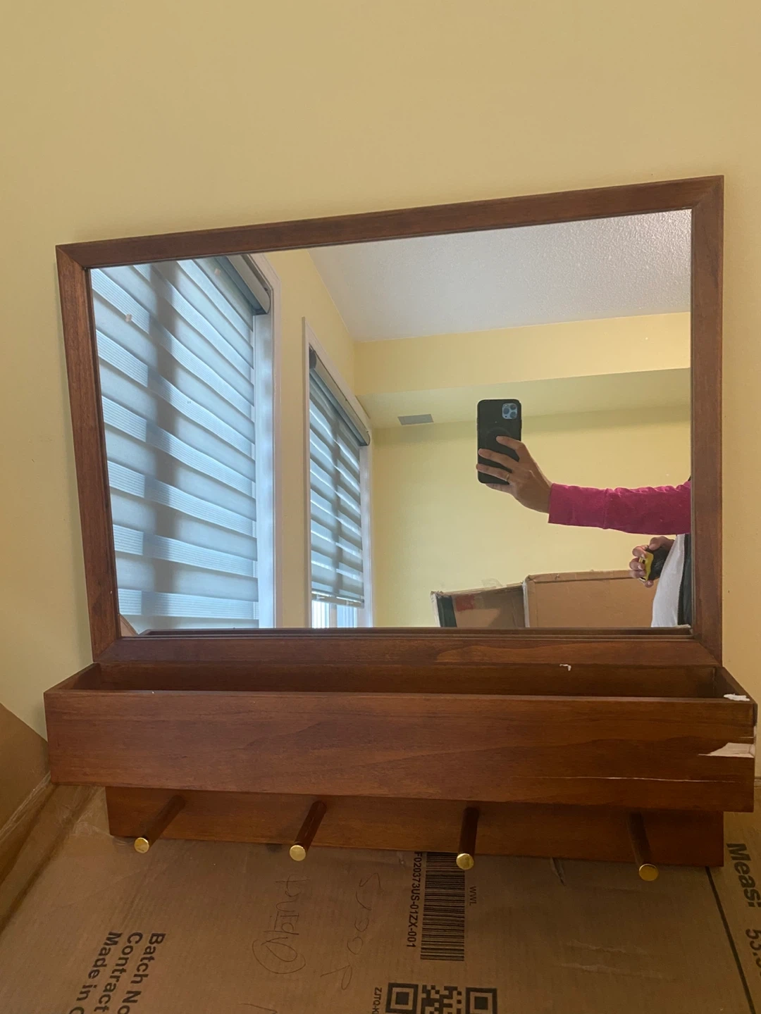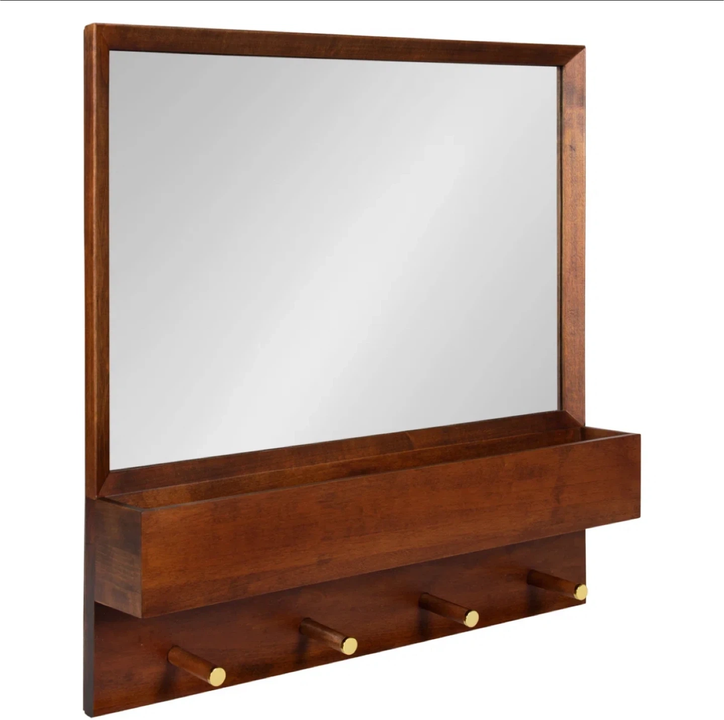 Selling a Winston Porter Jaela Wood Flat Mirror with Shelves. It's a stylish piece for any entryway or bedroom. This mirror features a flat design with a shelf and hooks, perfect for organizing your essentials. Originally bought for $252.99