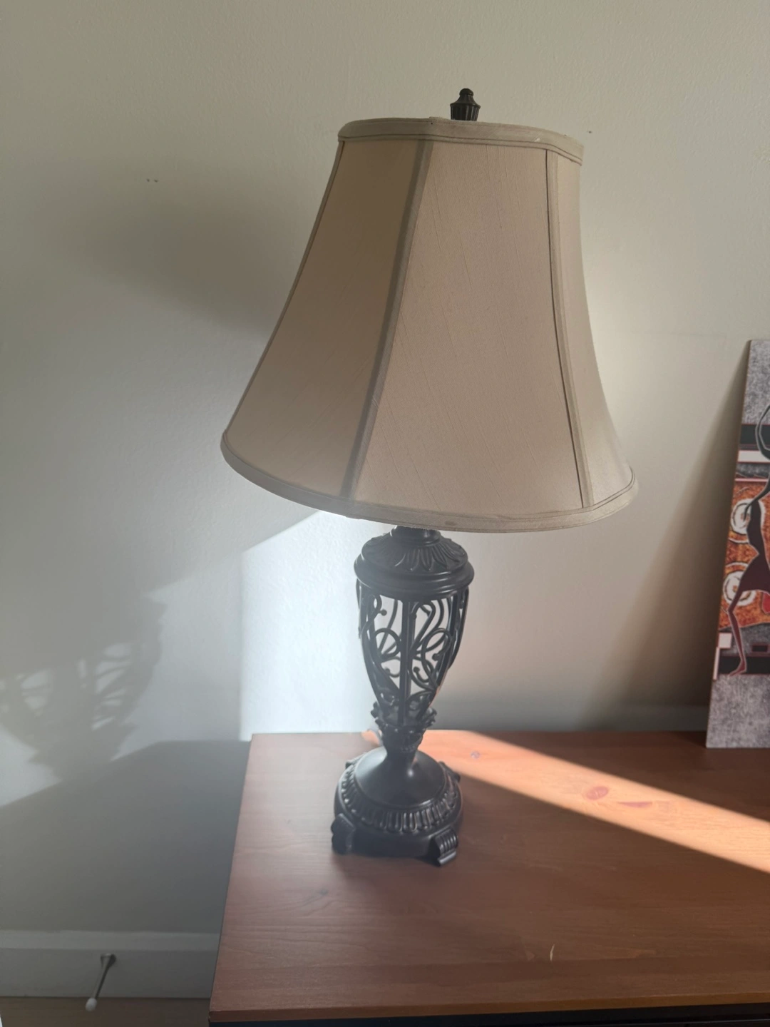 10Selling a table lamp with a beige shade and a decorative, ornate base. It's in good condition and would look great in any room! The base has a dark finish, and the shade is a classic tapered shape
