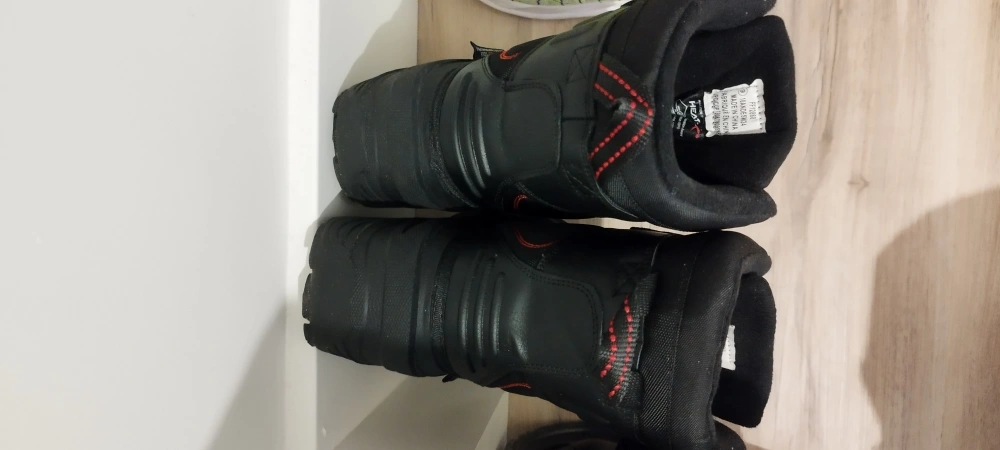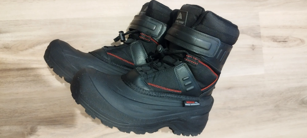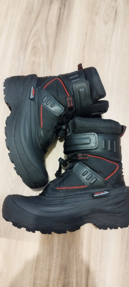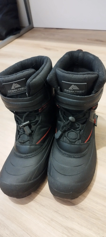 5Black winter boots with red accents. Velcro straps and laces. Waterproof and insulated. Great for snow and cold weather. used only twice.