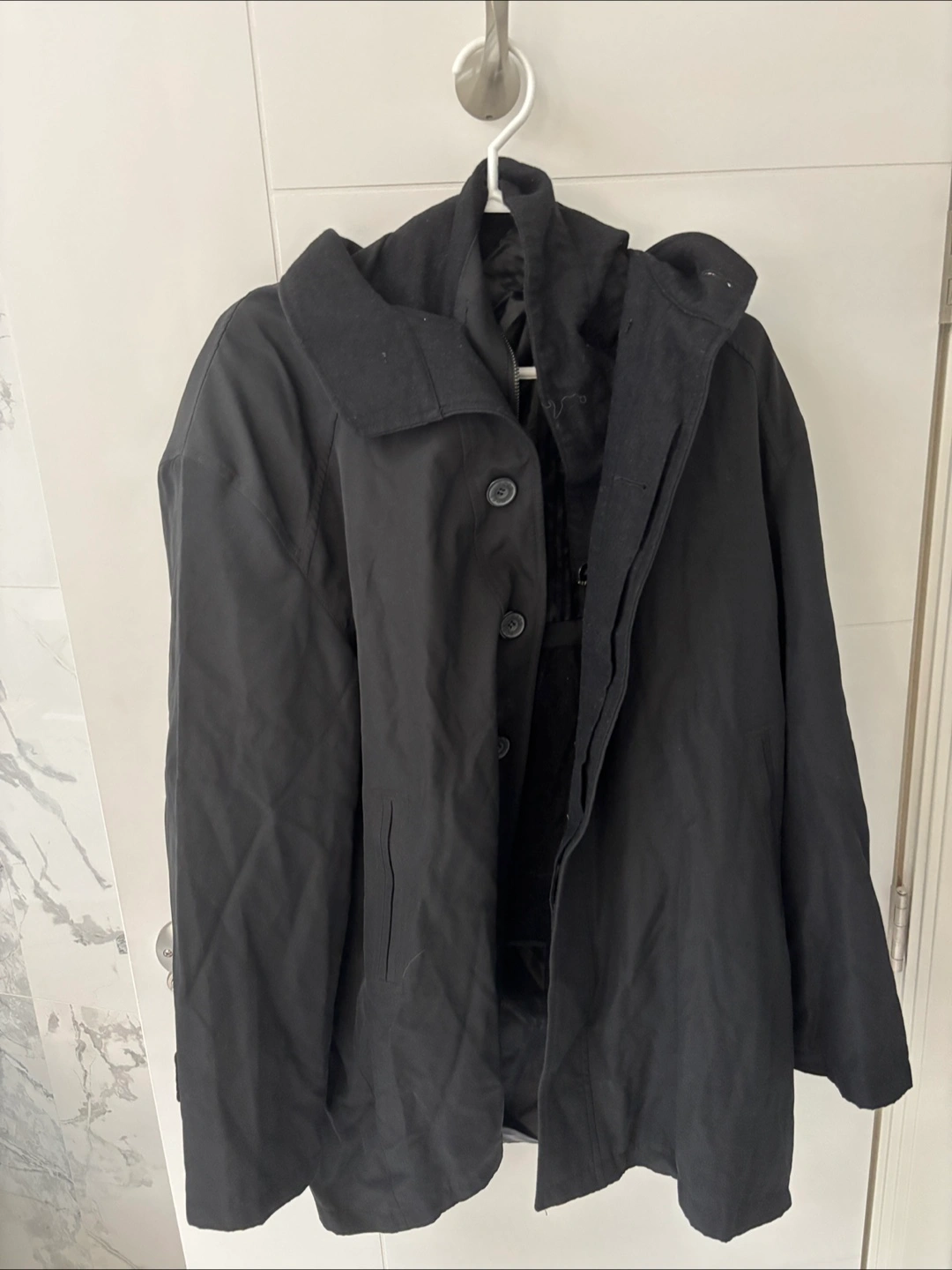60A classic black hooded jacket, perfect for layering or wearing on its own! It's in great condition and has a stylish, versatile look that can be dressed up or down. A great addition to any wardrobe!