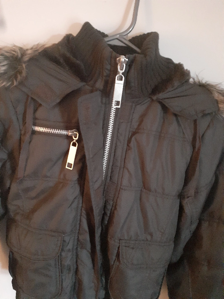 Stylish Women's Bomber style Jacket Attached Faux Fur Hood Excellent Condition. Can also fit Size Medium. Front Pockets. Extended ribbed cuffed sleeves. smoke and pet free home serious inquiries can deliver if within area.