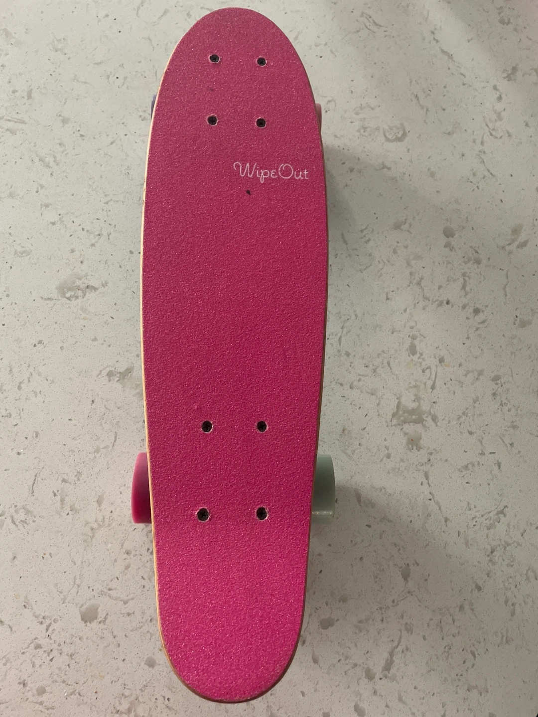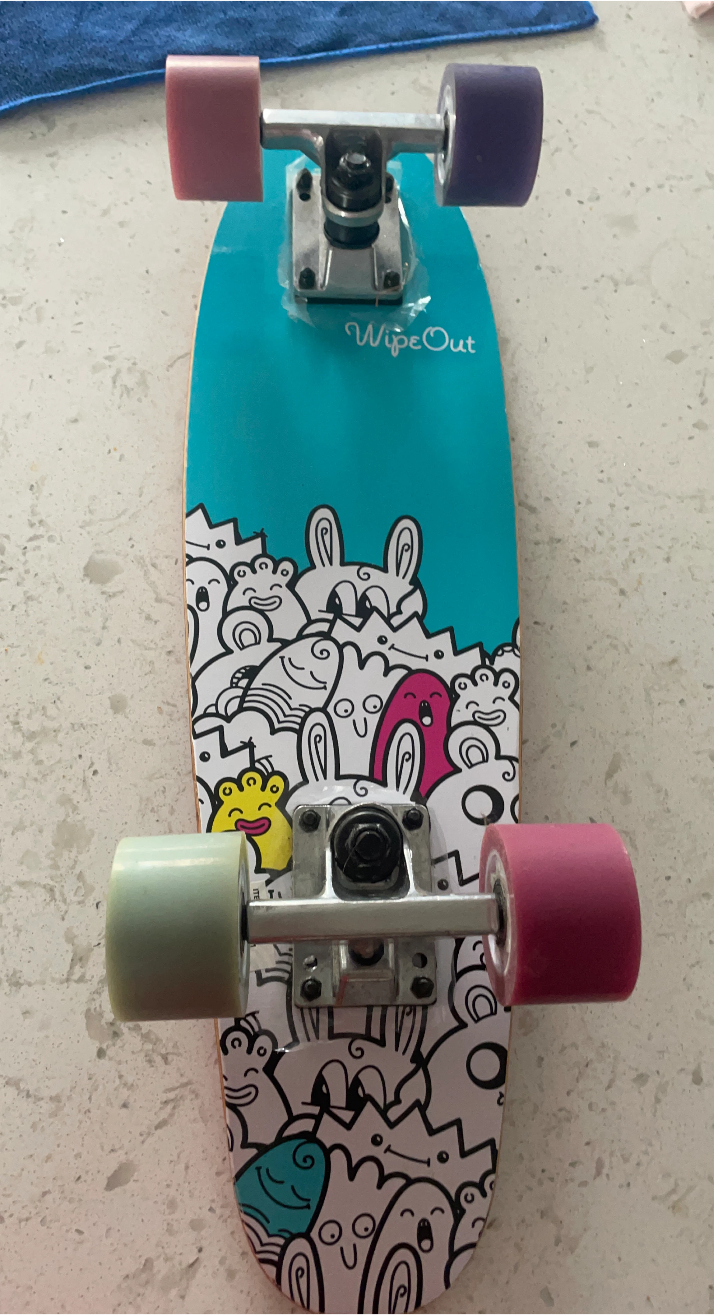 15Selling a used Wipeout skateboard! It's teal with a fun doodle design. The wheels are a mix of pink, purple, and green. Ready for a new home!