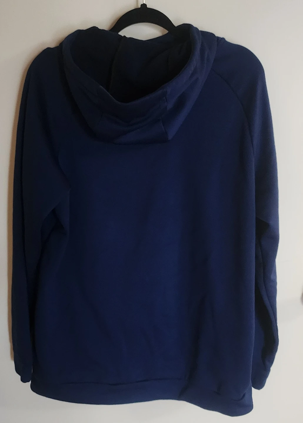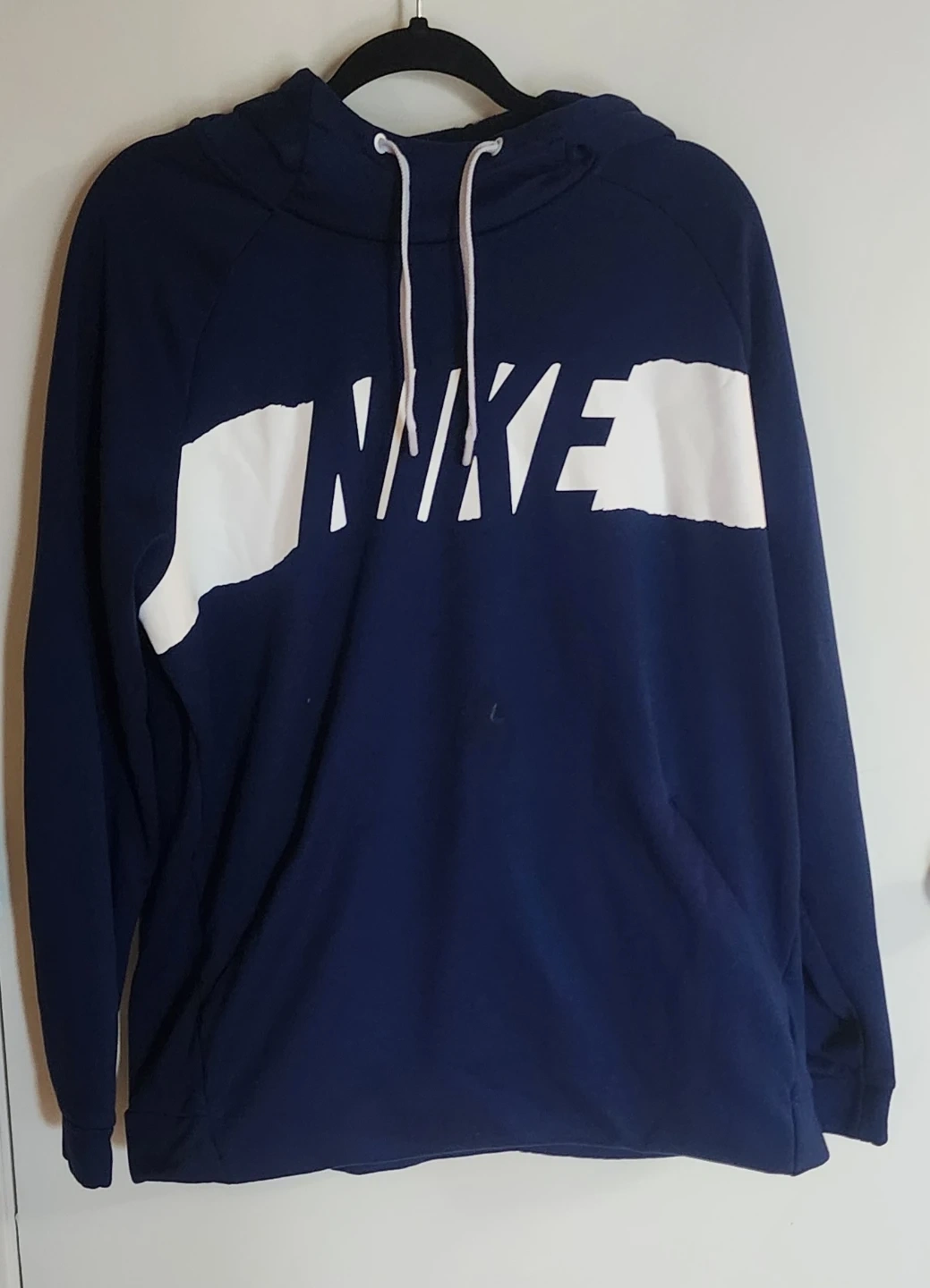 Navy blue Nike hoodie with a white graphic logo across the chest. It's a comfortable pullover style with a hood.