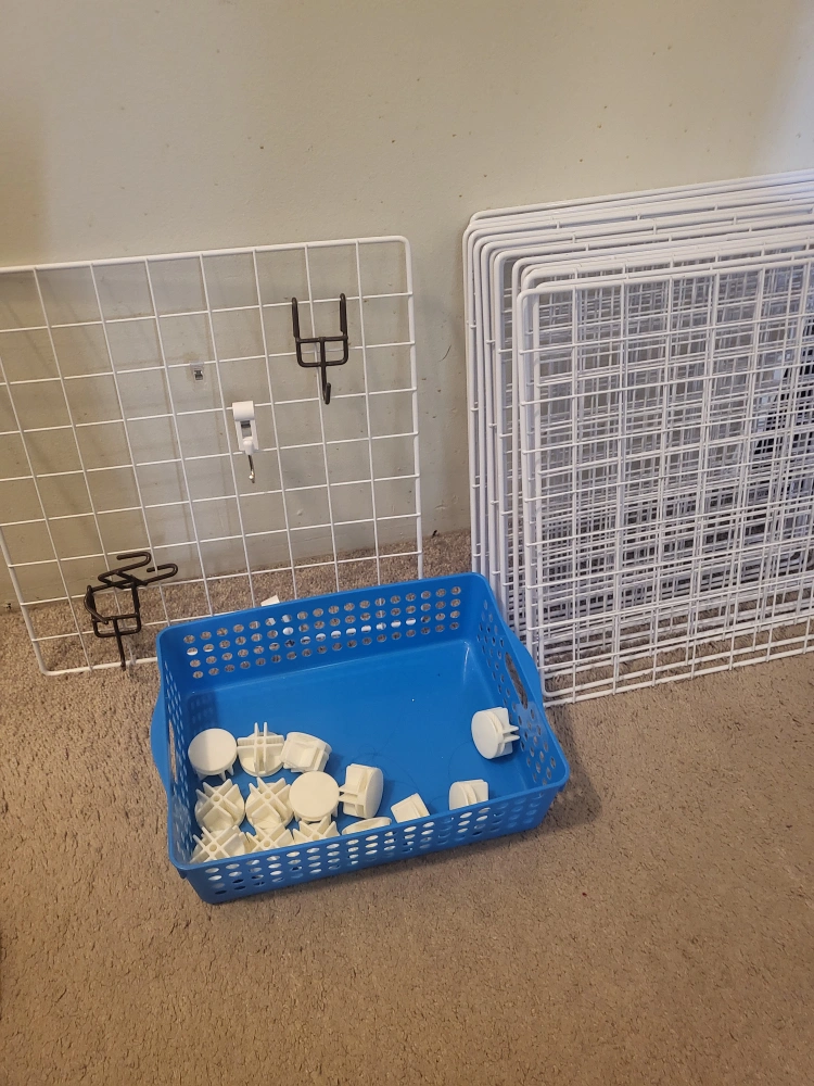Selling wire grid panels and connectors. Great for creating custom storage or pet enclosures! Includes a blue basket for the connectors.