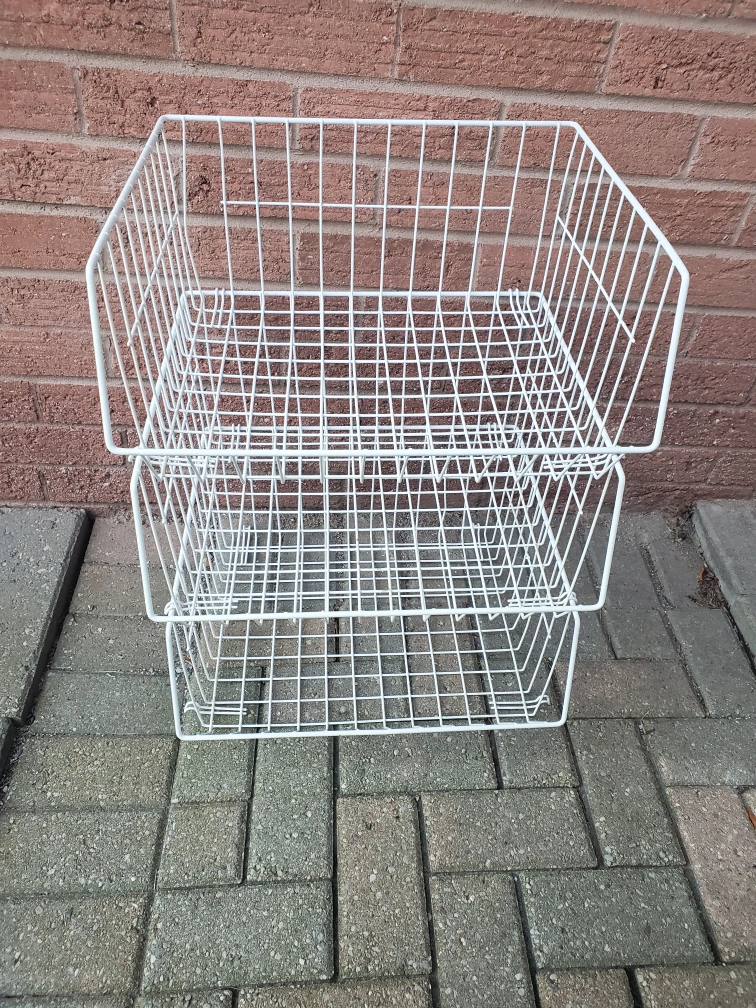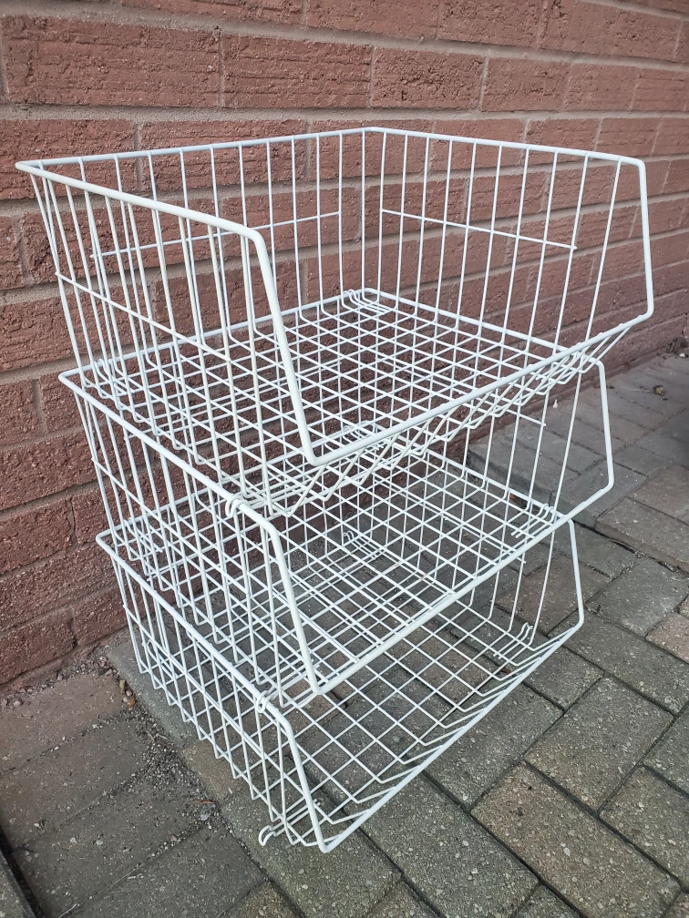 Here are three stackable wire storage baskets! These are great for adding some extra storage space in any room. They're in good condition and ready for a new home
