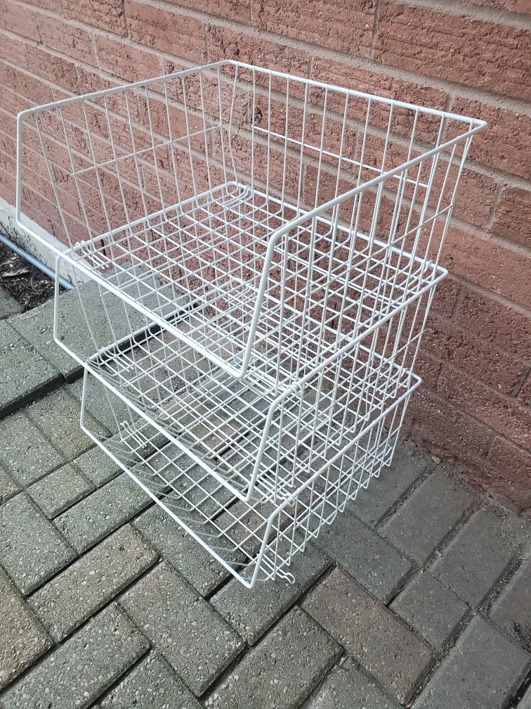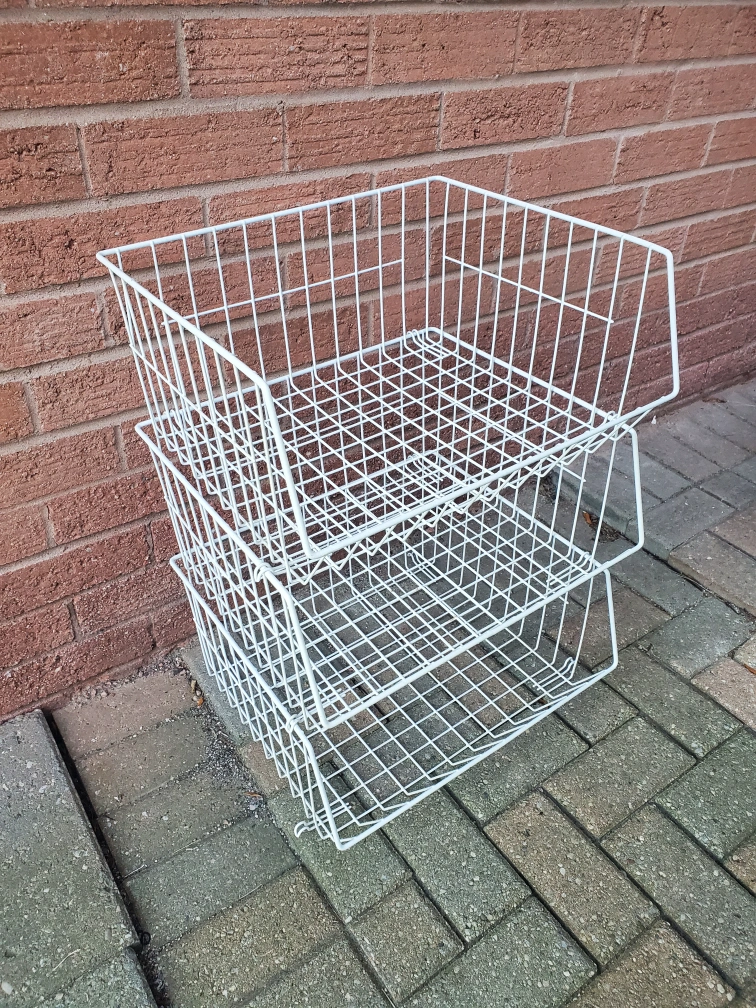 Here are three stackable wire storage baskets! These are great for adding some extra storage space in any room. They're in good condition and ready for a new home