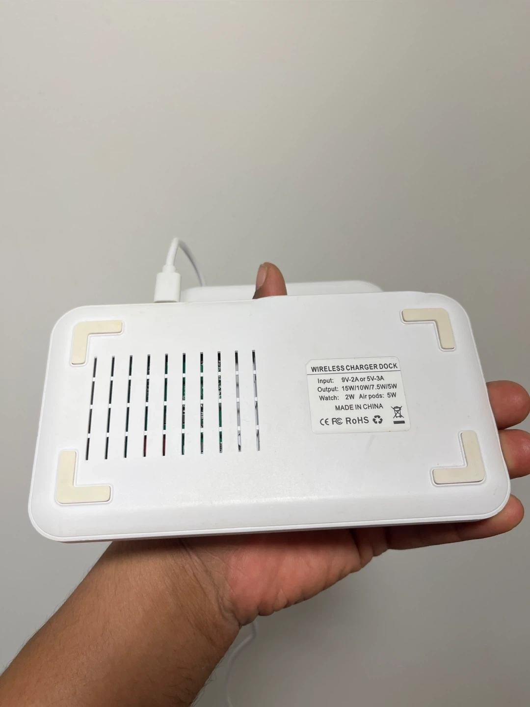 81Selling a white wireless charger dock. It can charge multiple devices at once! Input is 9V-2A or 5V-3A. Output is 15W/10W/7.5W/5W. Watch: 2W. Air pods: 5W