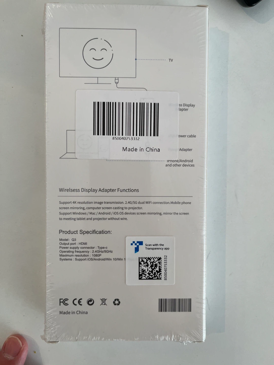 18Selling a brand new, still-in-box wireless display adapter. It supports 4K resolution image transmission and 2.4G/5G dual WiFi connection. It's perfect for mobile phone screen mirroring and computer screen casting to a projector. It supports Windows, Mac, Android, and iOS operating systems. Comes with wide compatibility, wireless connection, and stable signal. The model is Q3.