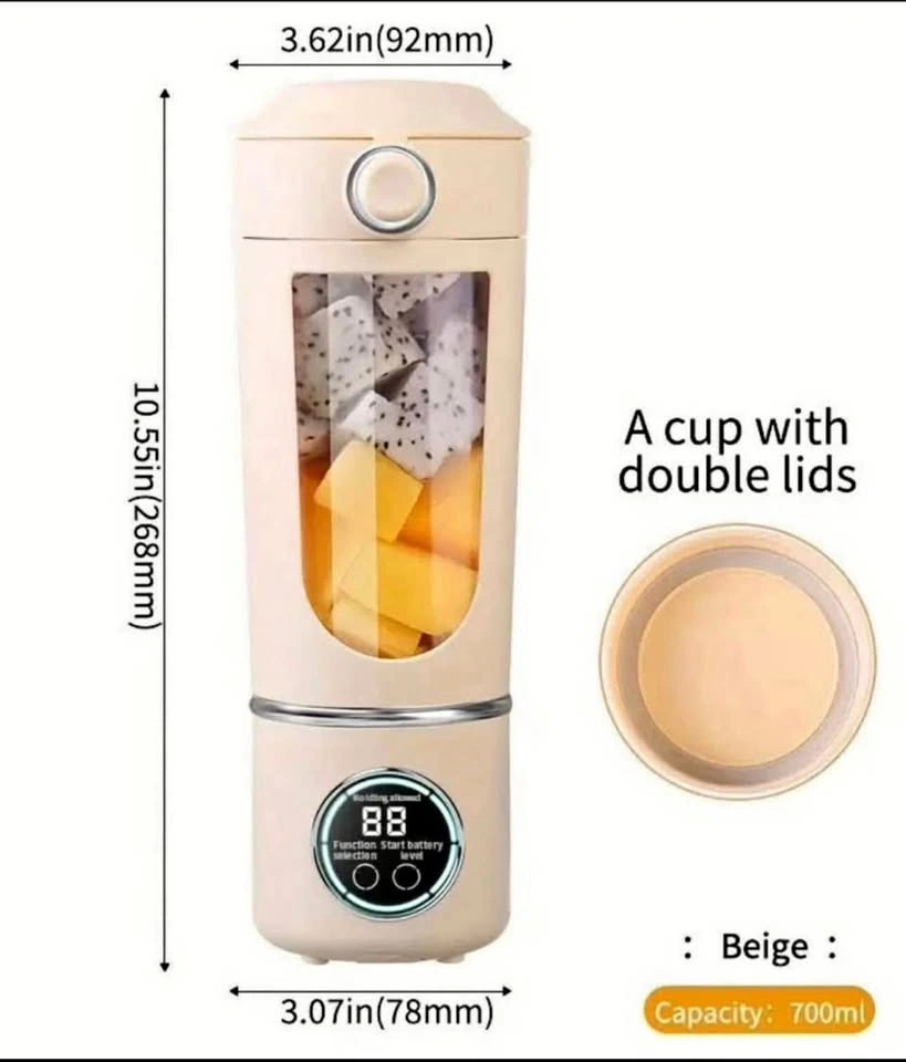 700 ML glass, can crush ice not nuts. 1500 mAH battery.