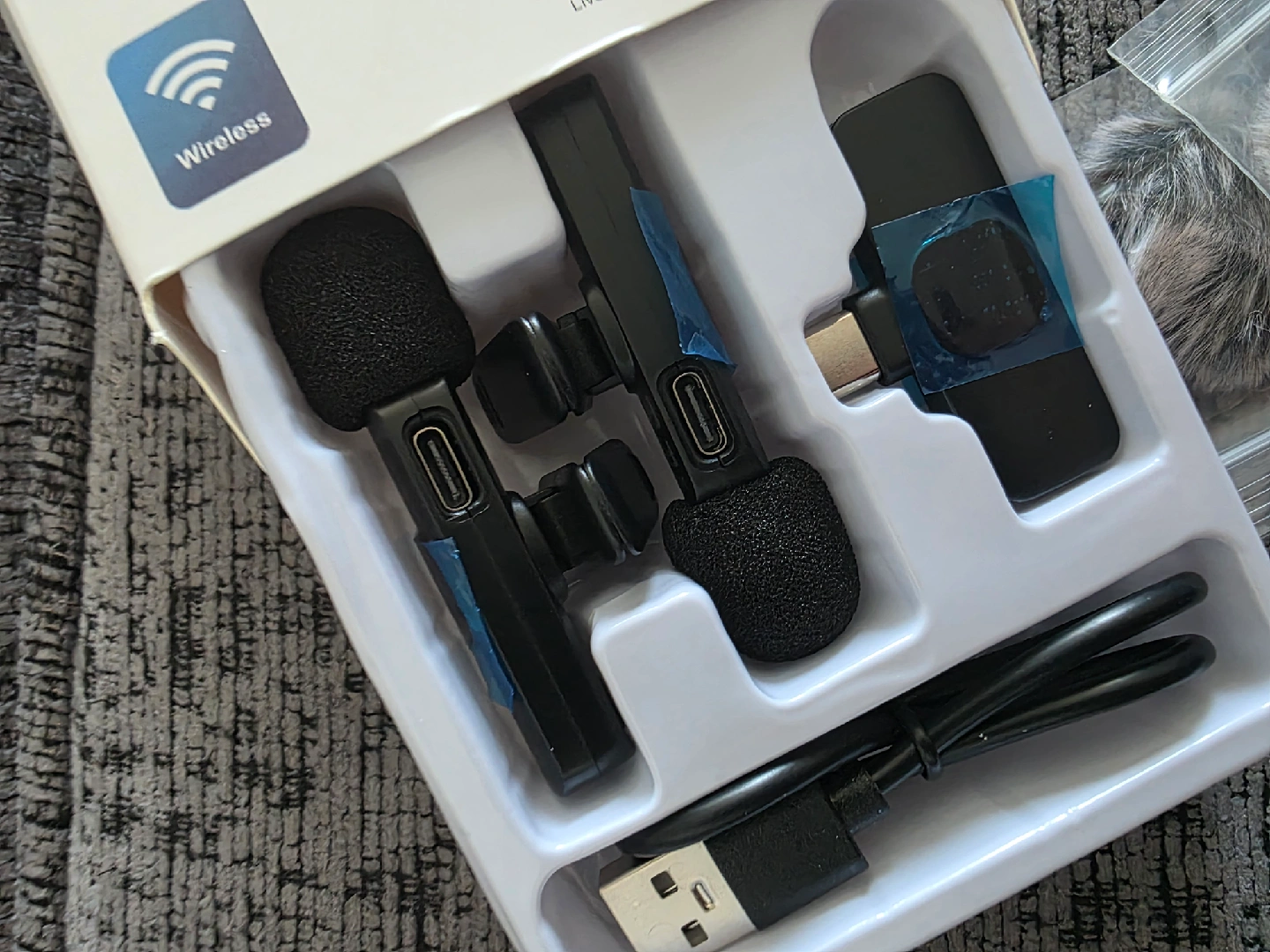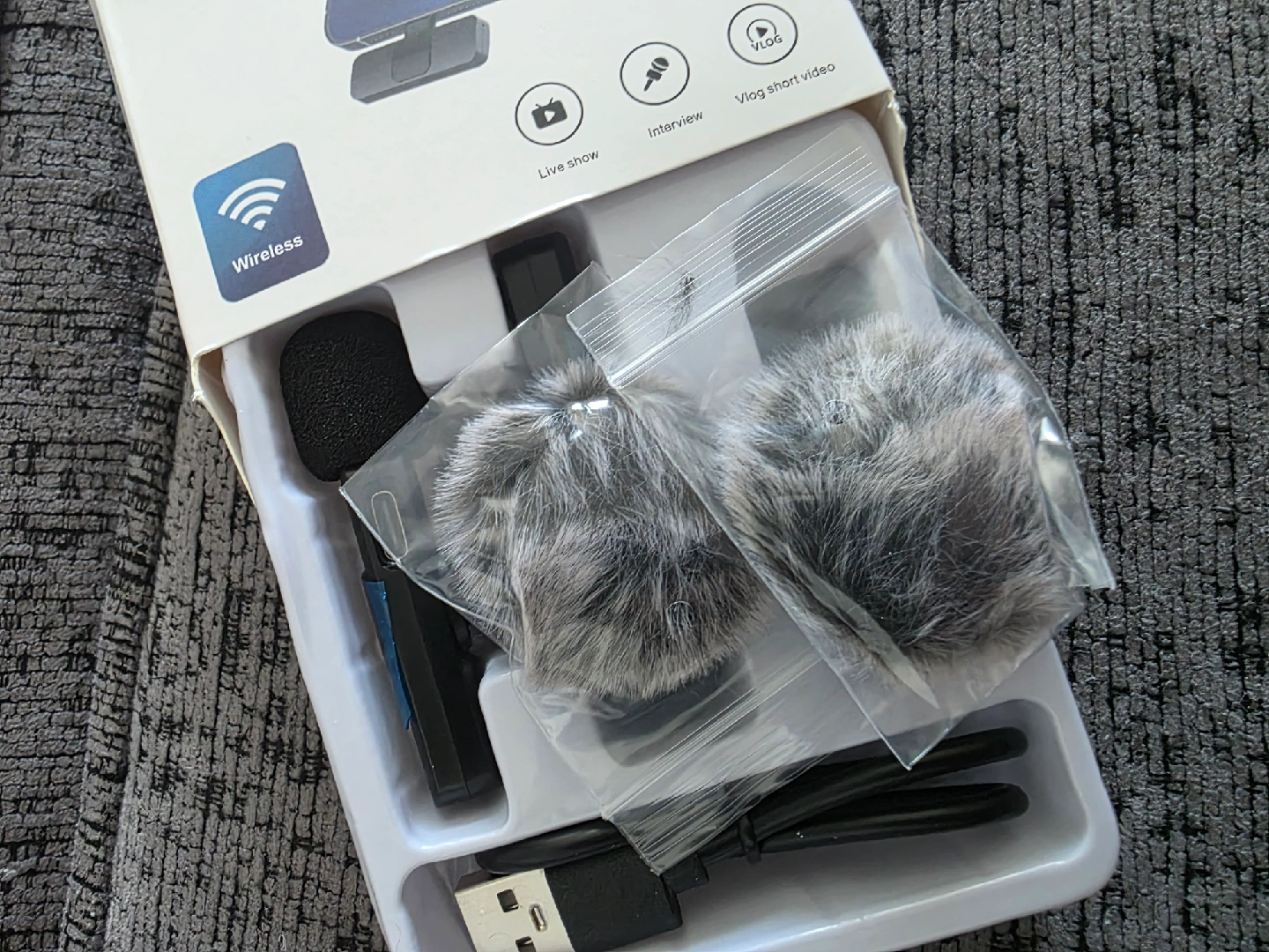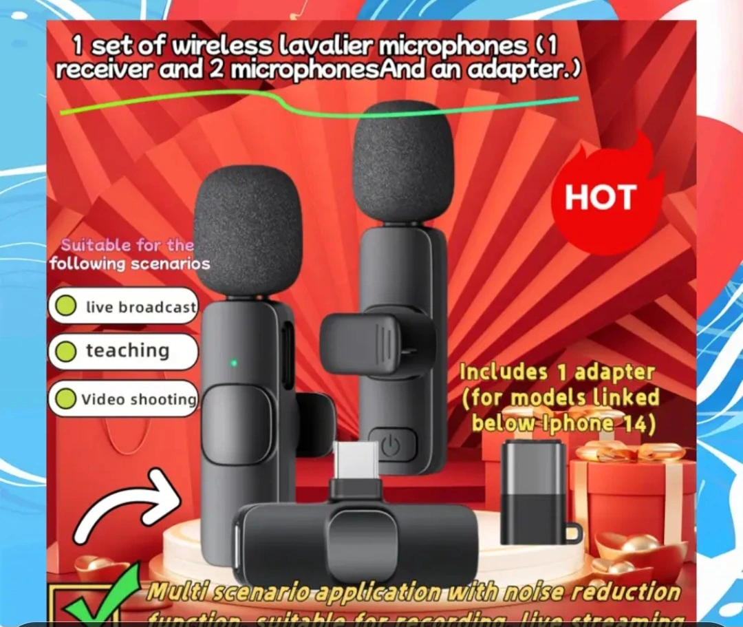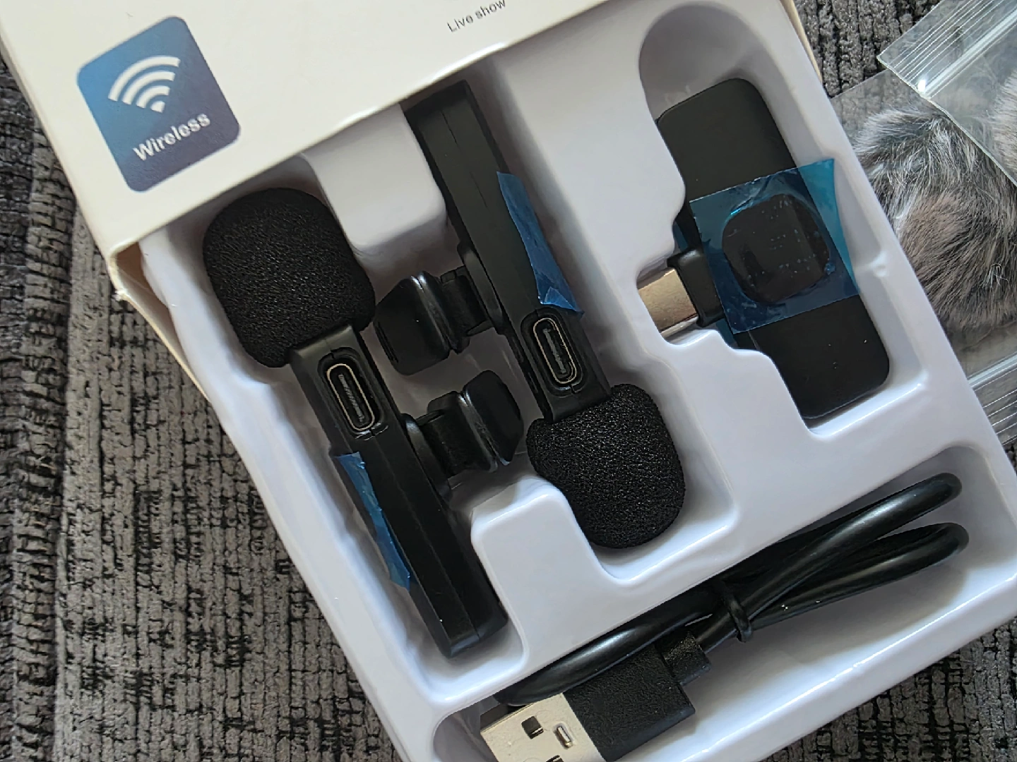 93Selling a brand new wireless lavalier microphone, perfect for live shows, interviews, and vlog short videos! It supports one to two microphones and includes a receiver, two microphones, and an adapter. Also comes with furry windscreens and a USB charging cable. Great for recording and noise reduction