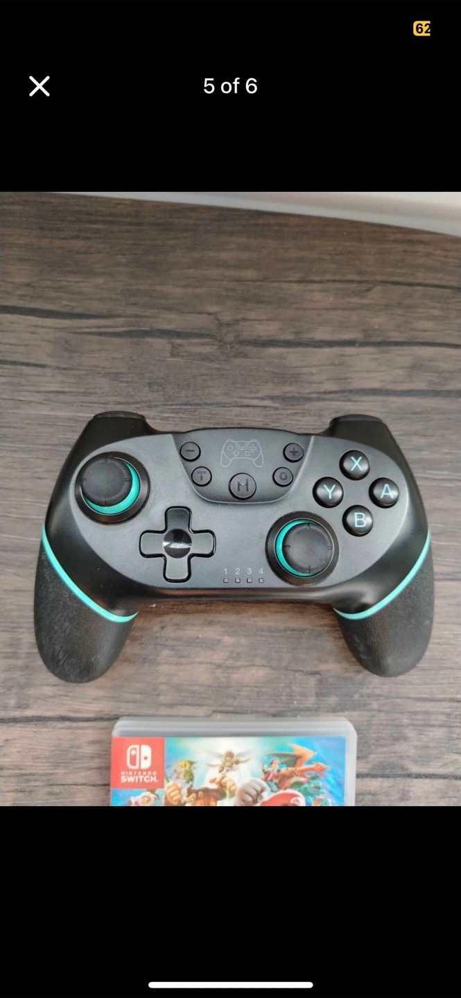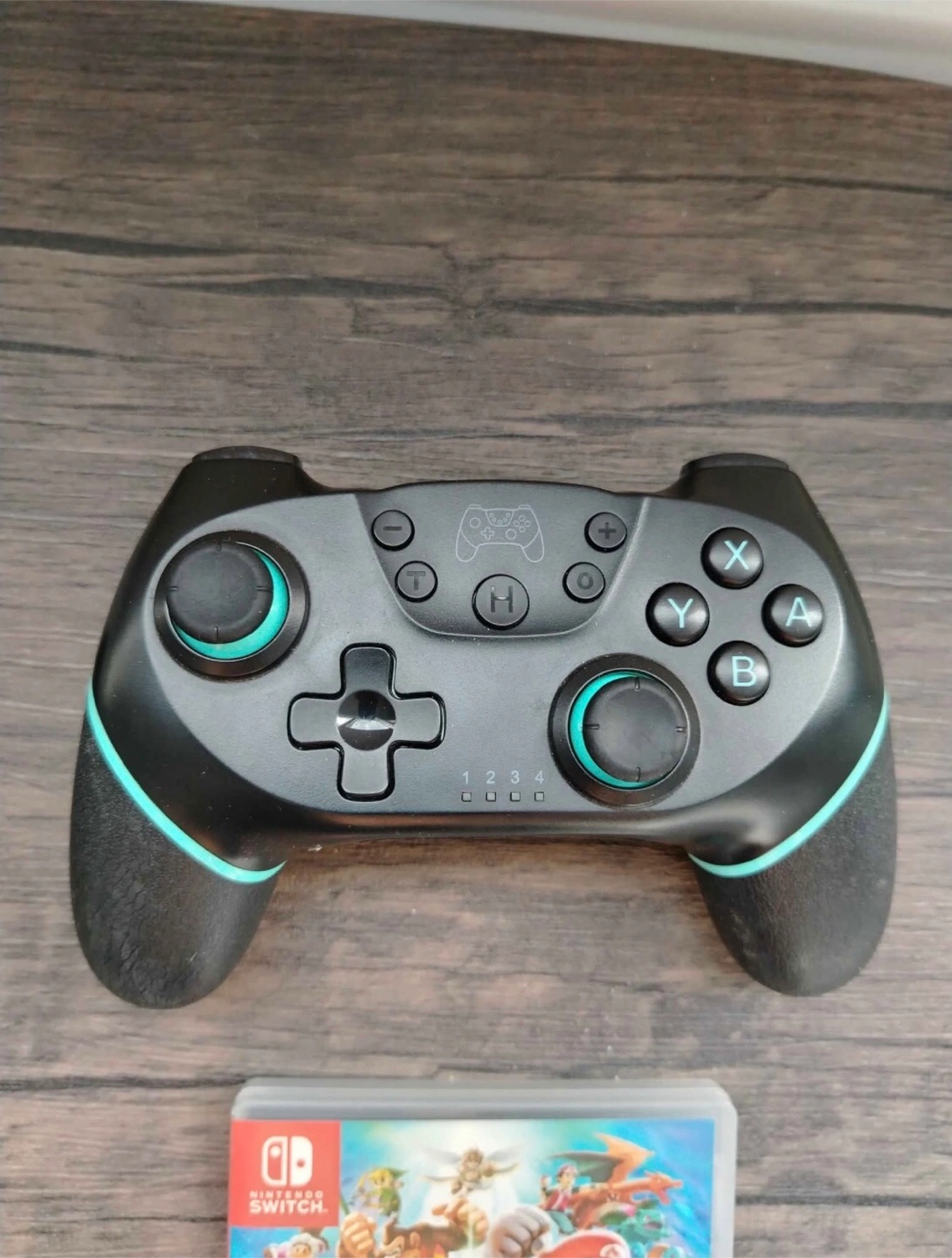 122A controller with black and teal accents. Features buttons, joysticks, and directional pad. Perfect for some quality gaming time.