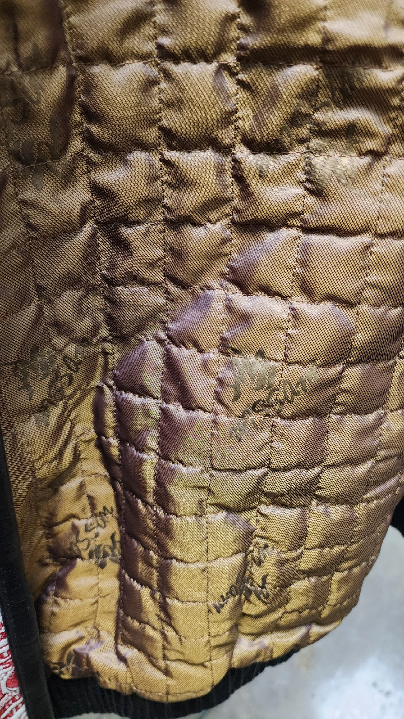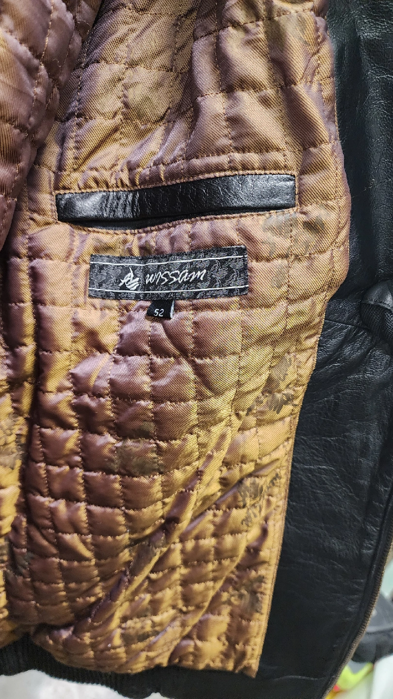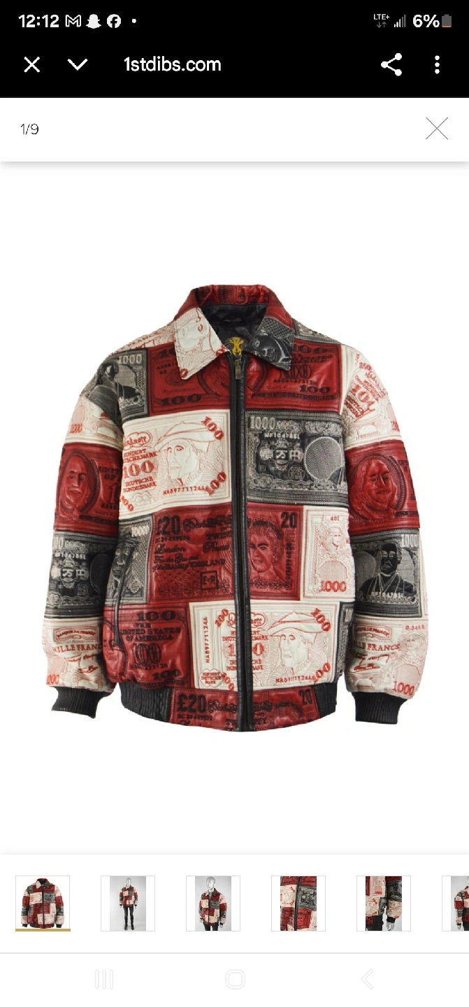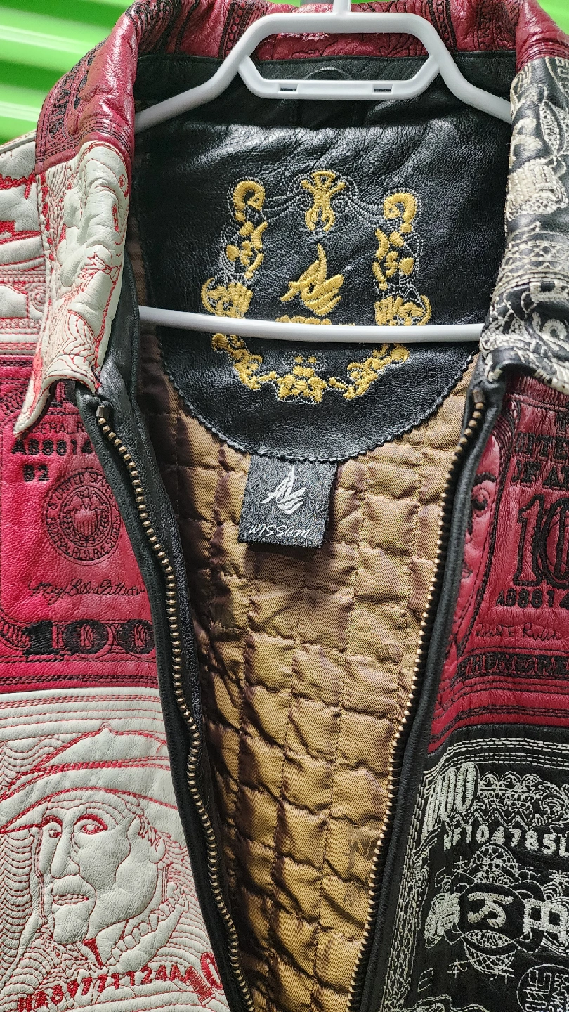 66Selling a Wissam leather jacket featuring a unique money print design! The jacket is a size 52 and is made of leather. It has a quilted interior lining.