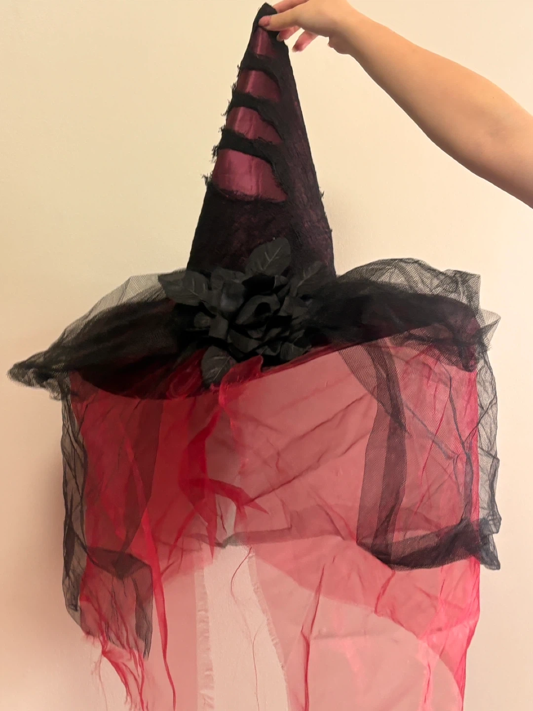 Selling a witch costume, perfect for Halloween or costume parties! It includes the dress (gown) and the hat. It is a gown so size-inclusive and in good condition. The dress is black and the hat is black and red with netting.