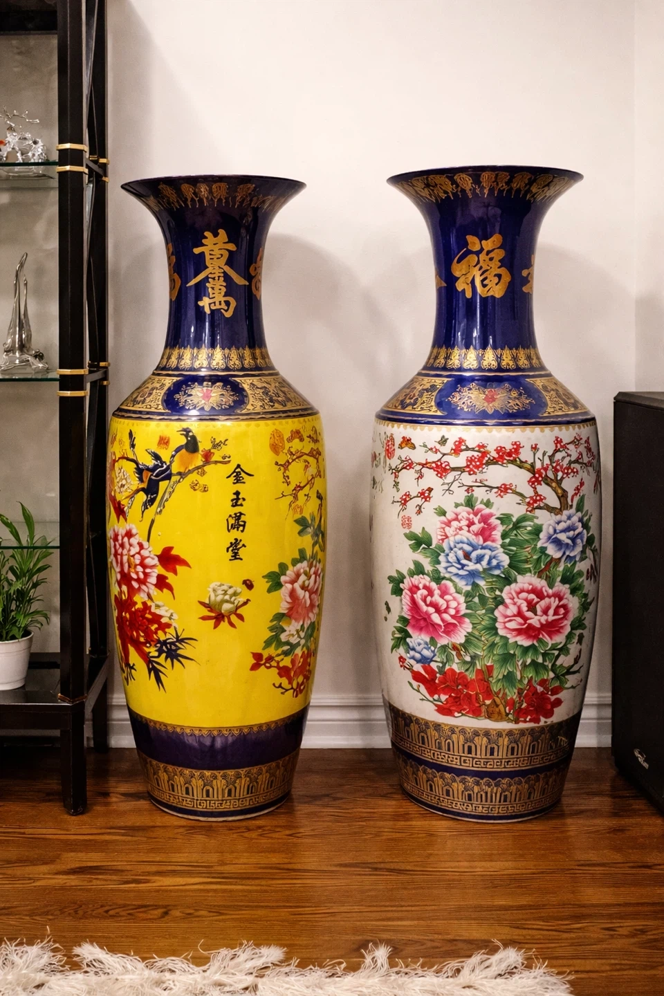 Two striking large oriental vases, perfect for adding a touch of elegance to any room. One features a vibrant yellow base with birds and floral motifs, while the other showcases a white base with detailed floral designs. They're both finished with a rich blue neck and ornate gold detailing. These statement pieces will certainly catch the eye!