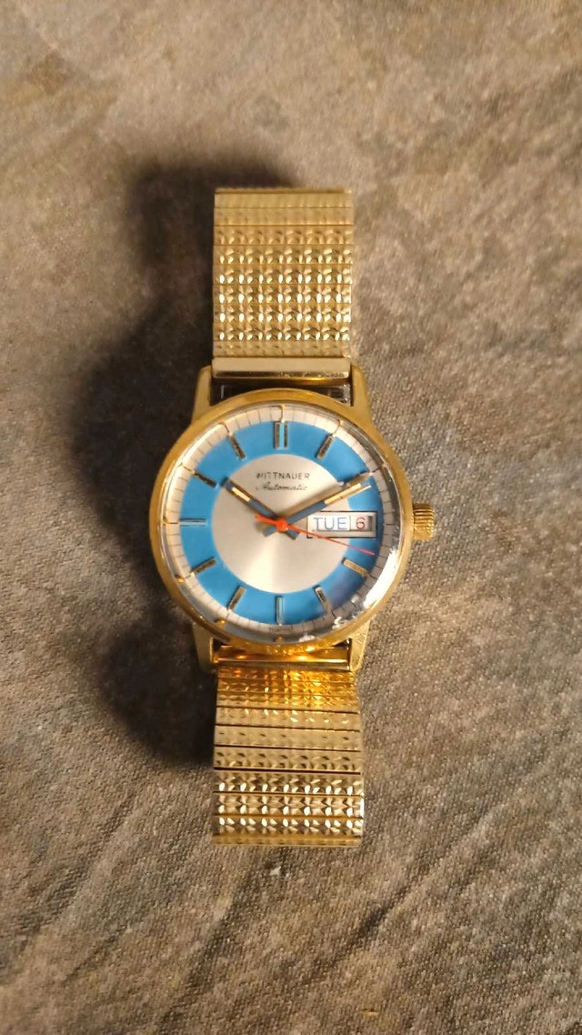 Check out this vintage Wittnauer Swiss Automatic watch, a stylish timepiece with a blue and gold colour scheme and day-date display. This watch has an automatic movement, ensuring you'll never need to wind it! It is in used condition with visible wear and tear. * Brand: Wittnauer * Movement: Automatic * Display: Analogue * Features: Day/Date If the ad's still up, it's still up for grabs!