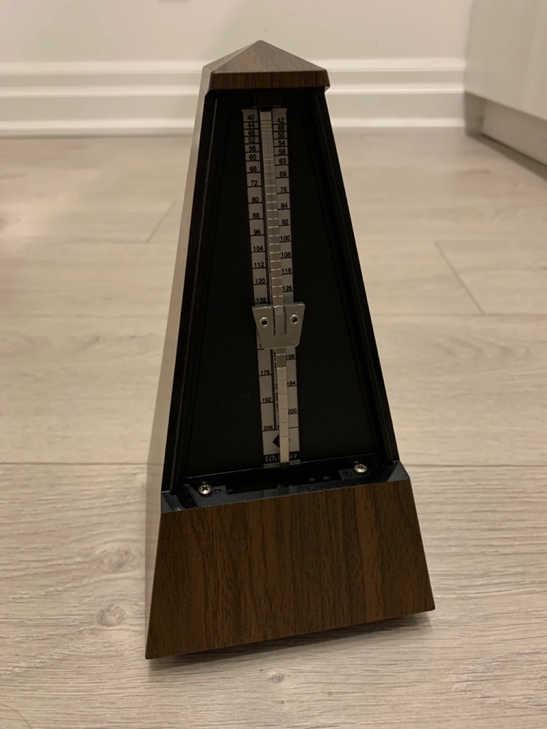 Selling a Wittner metronome. It's in great condition and ready to help you keep the beat! Excellent German craftsmanship and the highest grade hardwoods are coupled to produce these wood case models The famous wind-up mechanism produces the visual pendulum signal along with an audible tick at the end of each stroke A small slide switching device on the side of the metronome lets you choose an accented beat of 0,2,3,4, and 6, sounding a bell that will ring on the first beat of each measure Tempo selector is adjustable from 40 to 208 beats per minute Matte walnut