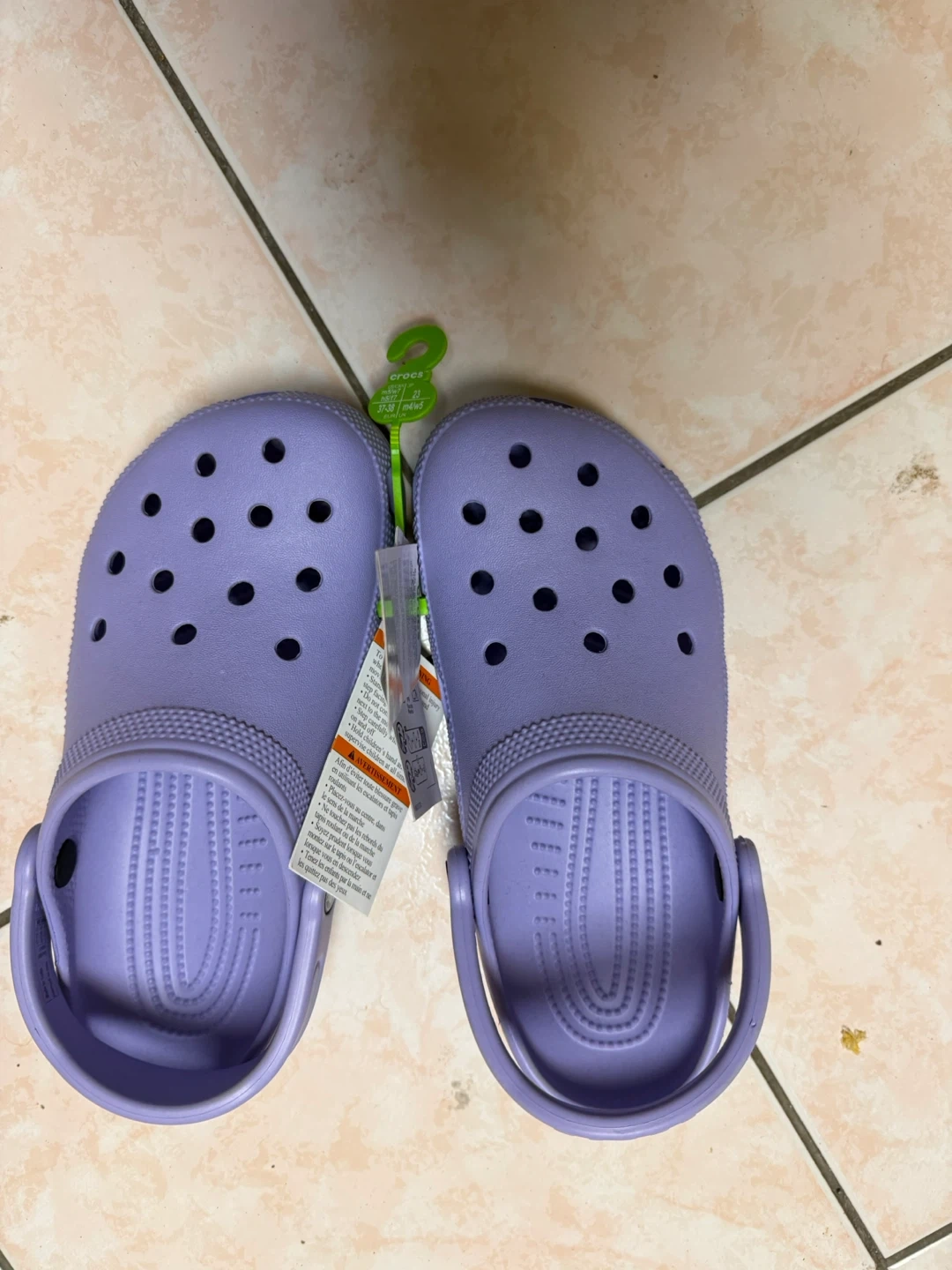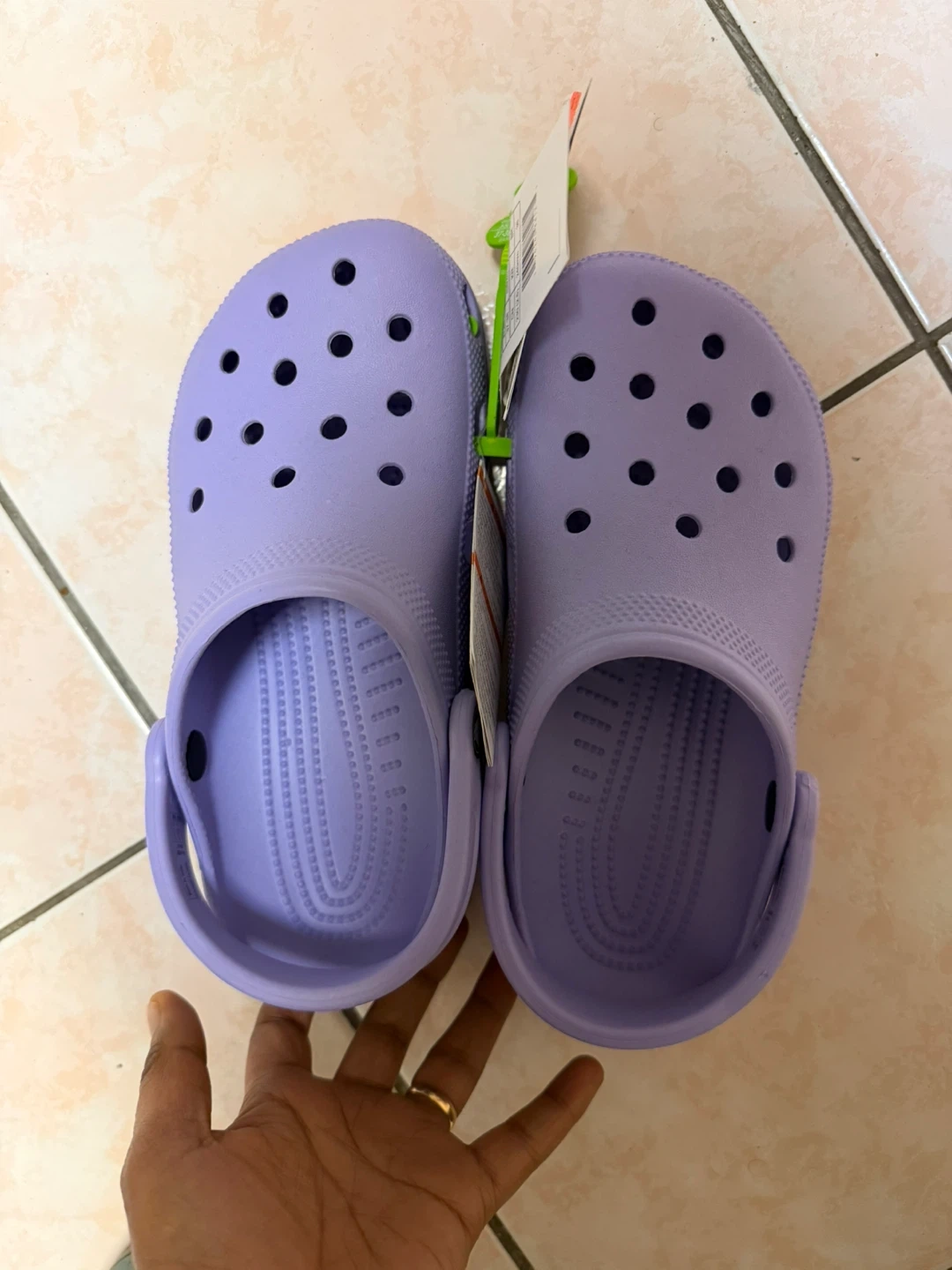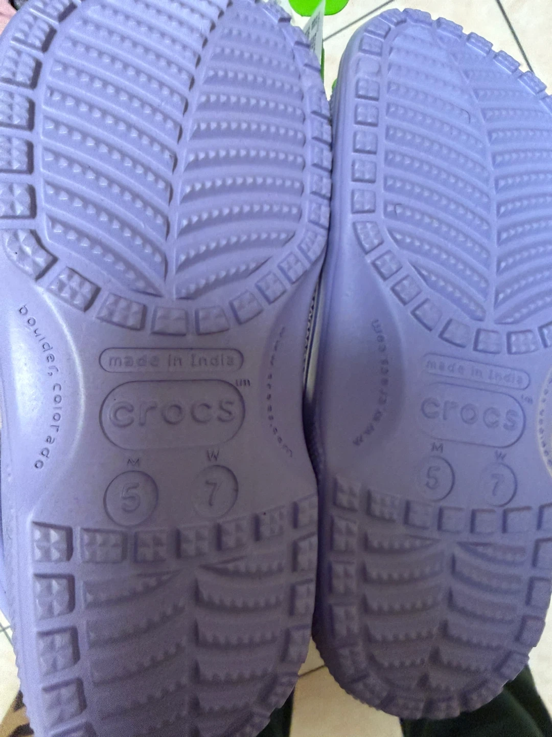 These are a pair of Crocs Classic Clogs in a light purple lavender colour. They are a women's size 7. Made in India. Perfect for casual wear!