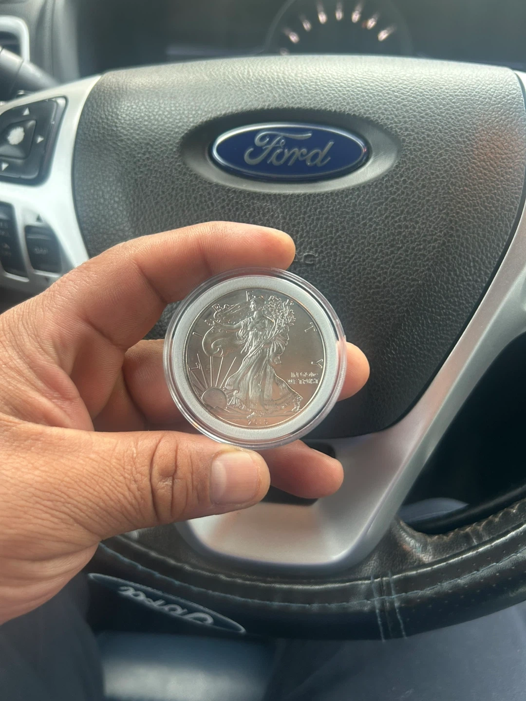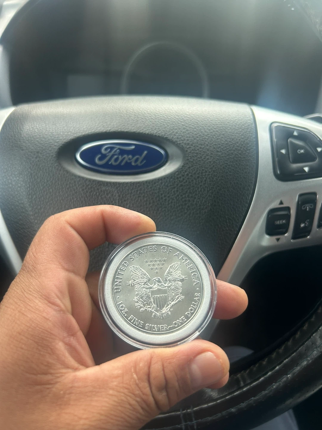 This is a 1 oz fine silver American Eagle one dollar coin. It's encapsulated in a protective case. Struck by the United States Mint.