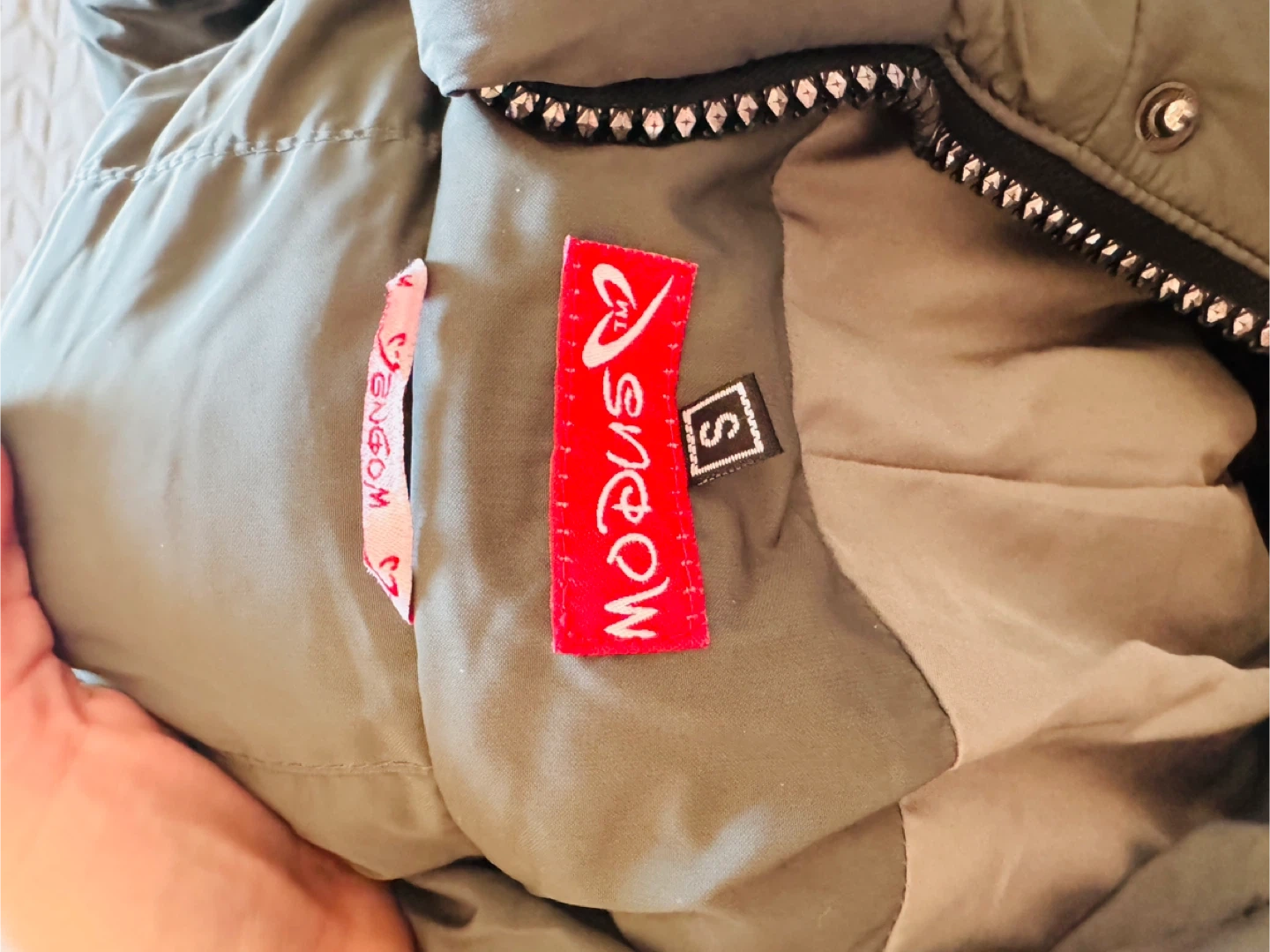 Long green puffer jacket. Has a hood and two pockets. Double zip and button closure