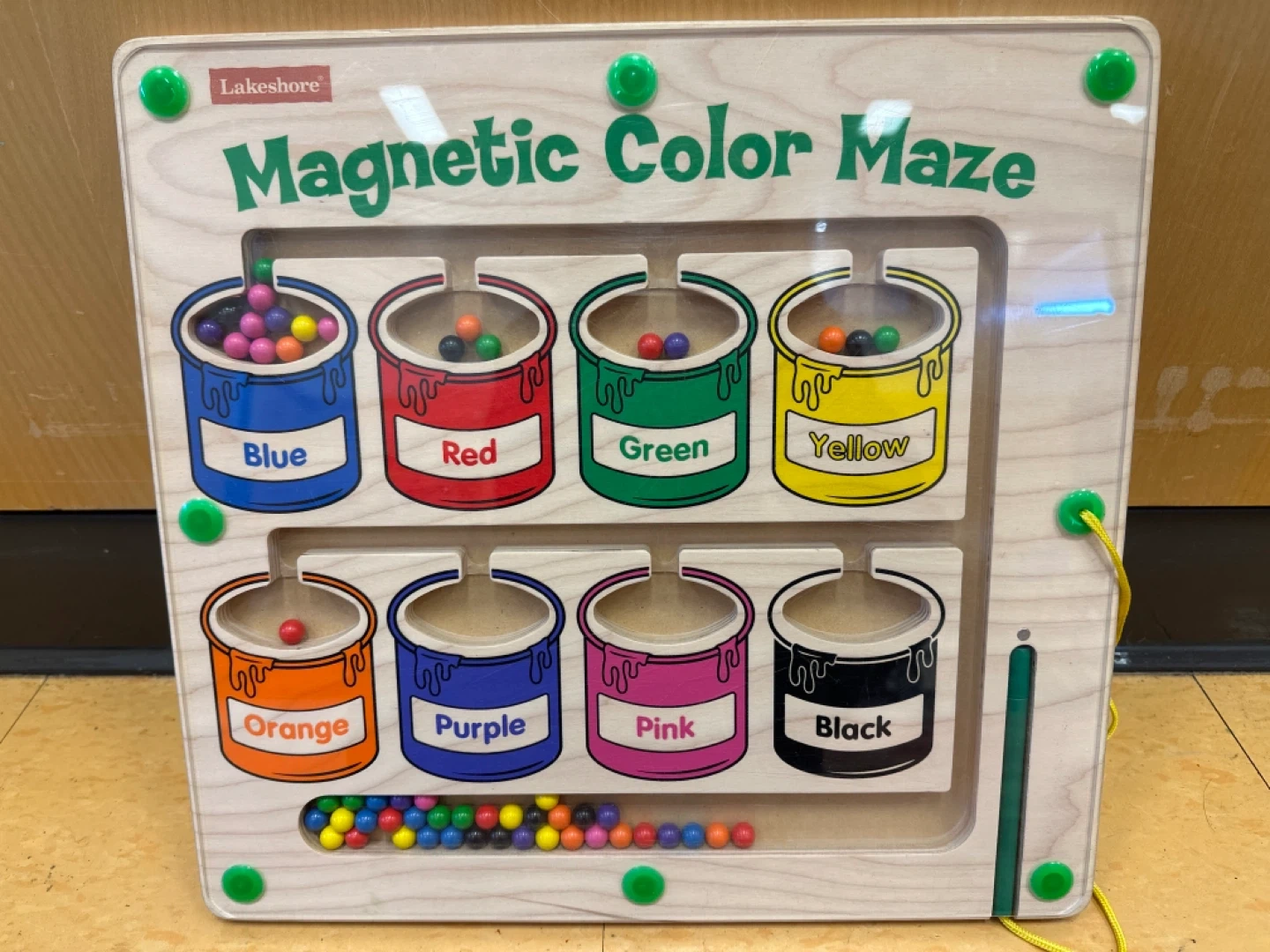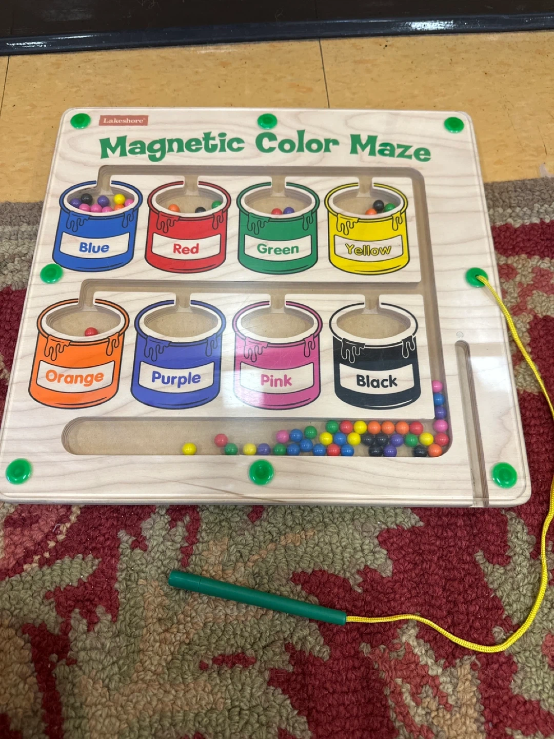 This Lakeshore Magnetic Color Maze toy has eight paint cans labelled with colours. It helps kids sort and match coloured beads. Beads are moved with a magnetic wand. It's great for developing fine motor skills and colour recognition!