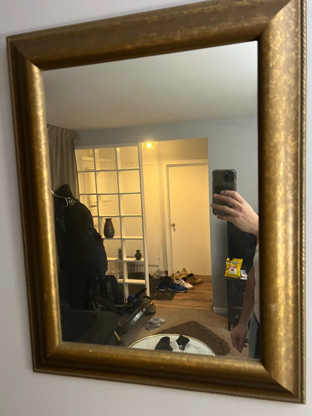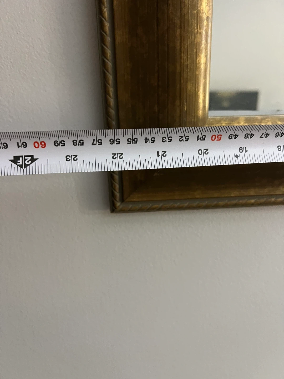 A used vintage-style wall mirror with a decorative gold frame. It's perfect for adding a touch of elegance to any room. The frame has a textured, antique finish.