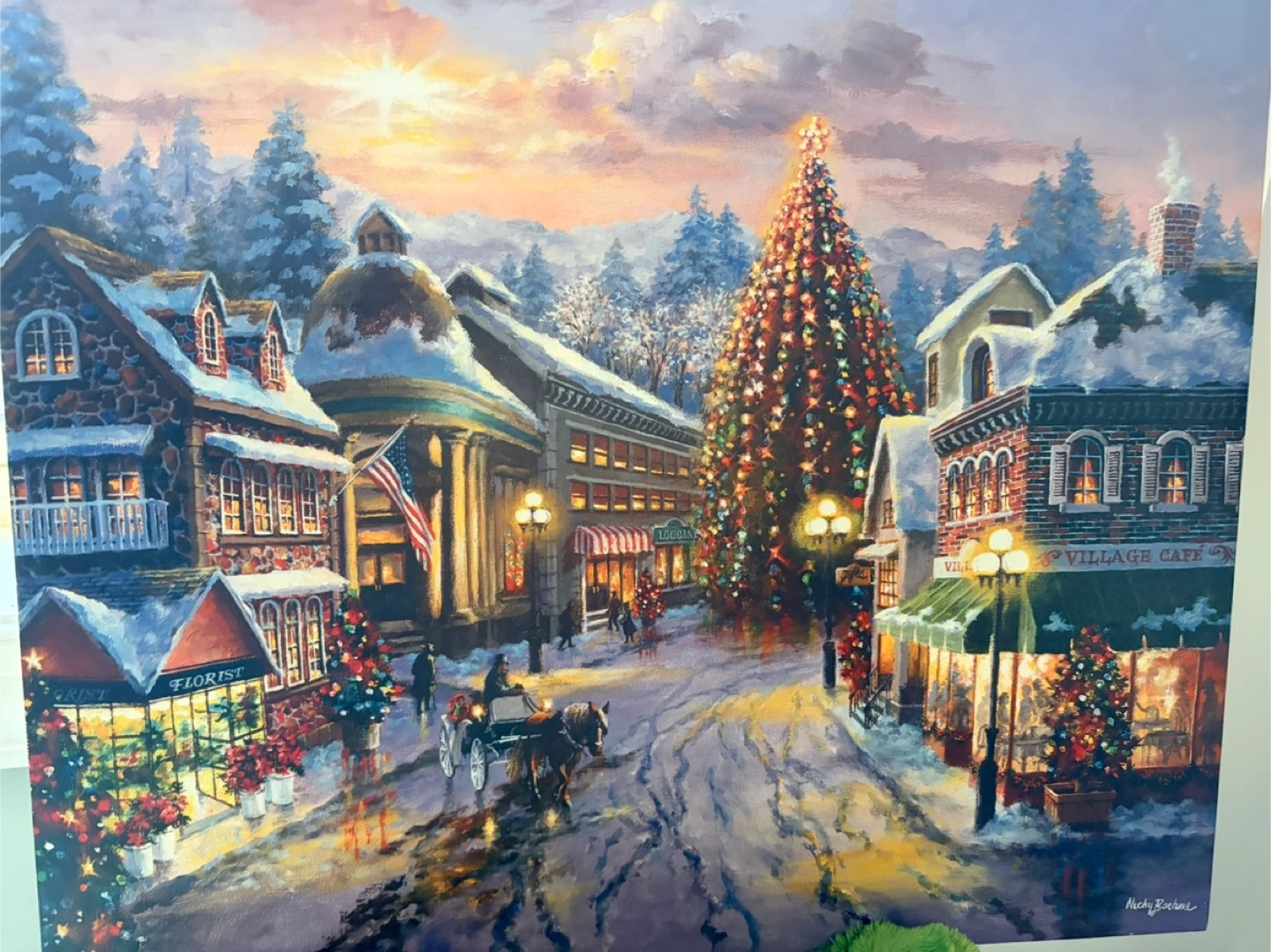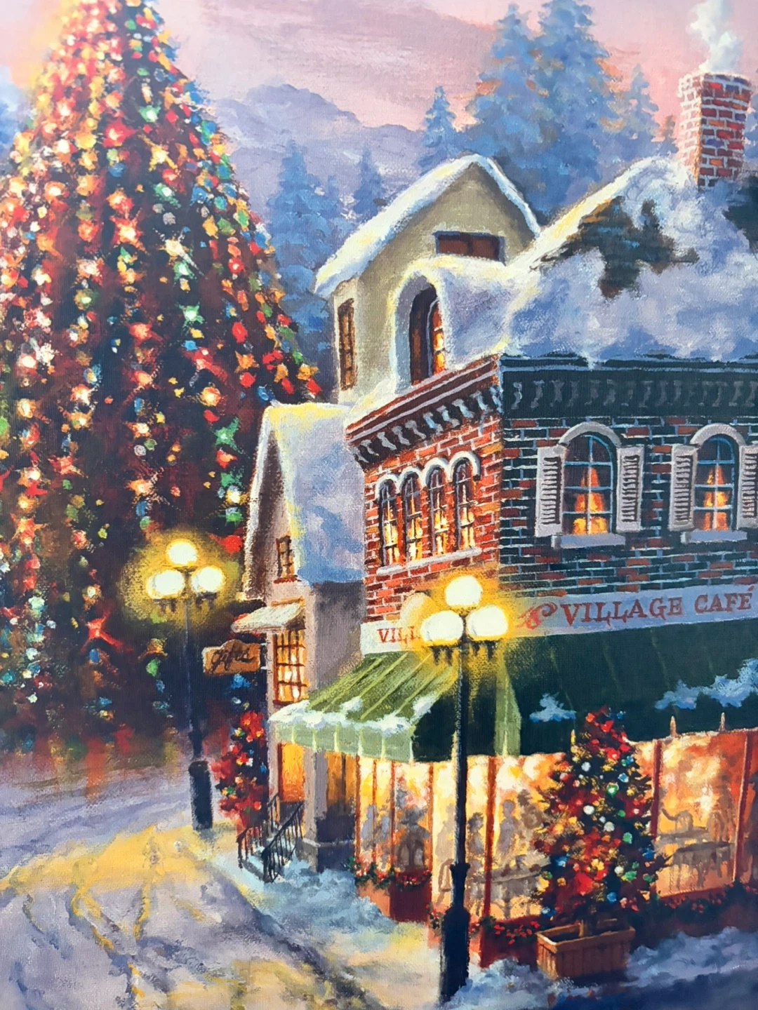 This beautiful wall art depicts a charming winter village scene with a large decorated Christmas tree in the center. Snow-covered buildings like a florist and a cafe line the street, illuminated by warm lights. A horse-drawn carriage adds a festive touch to the snowy evening. It's perfect for adding a cozy holiday atmosphere to your home!