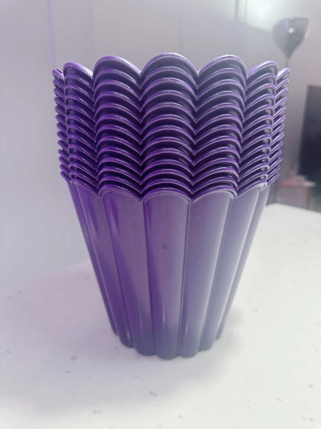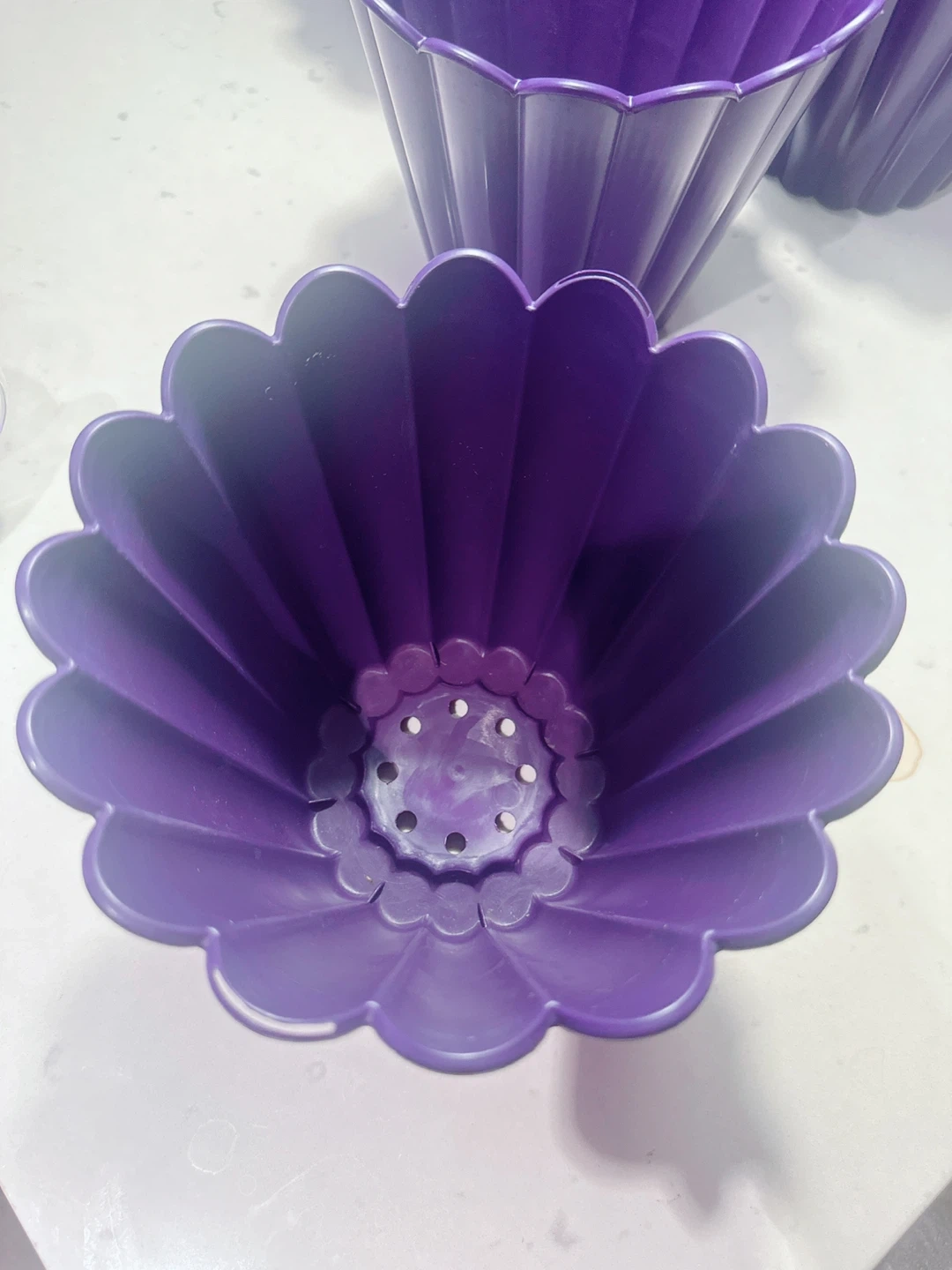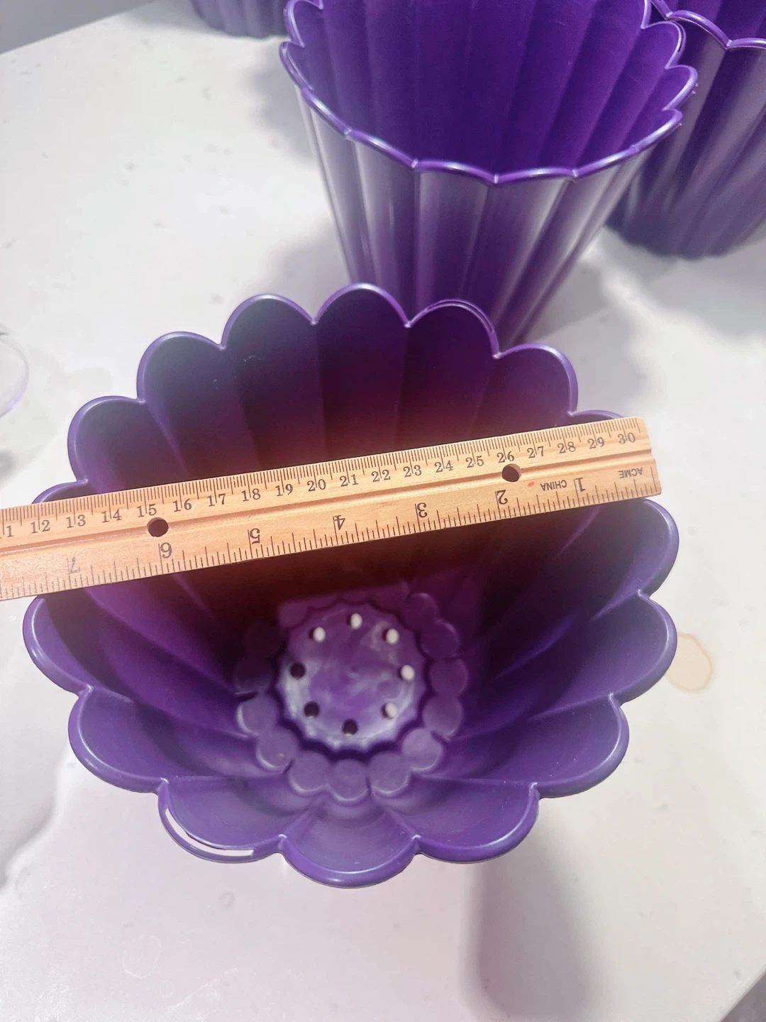 Selling a set of 13 purple plastic flower pots. They're decorative and have drainage holes at the bottom. The pots measure approximately 6 inches tall and 7 inches in diameter at the top. These would be neat for small indoor plants!
