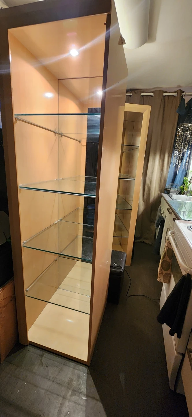 These tall display cabinets features multiple tempered glass shelves and internal lighting. It's perfect for showcasing collectibles or retail items. They are solid wood (so quite heavy), the exterior has a wood-grain finish. They were made in Italy. Great condition. No scratches.
