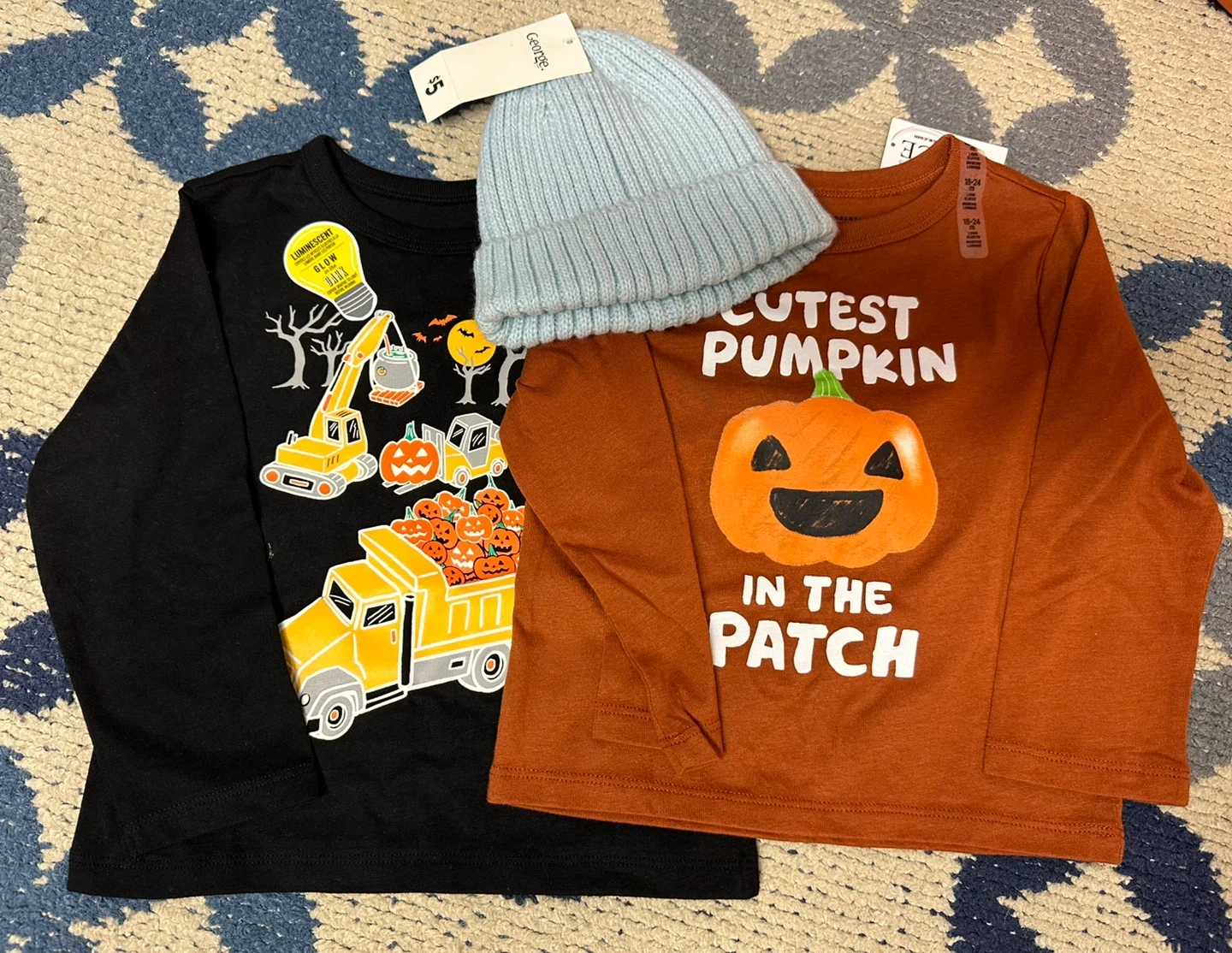 Two long sleeve shirts for kids; one black with a glow-in-the-dark construction themed and one orange with a "Cutest Pumpkin in the Patch" graphic. The bundle also includes a light blue ribbed knit beanie.