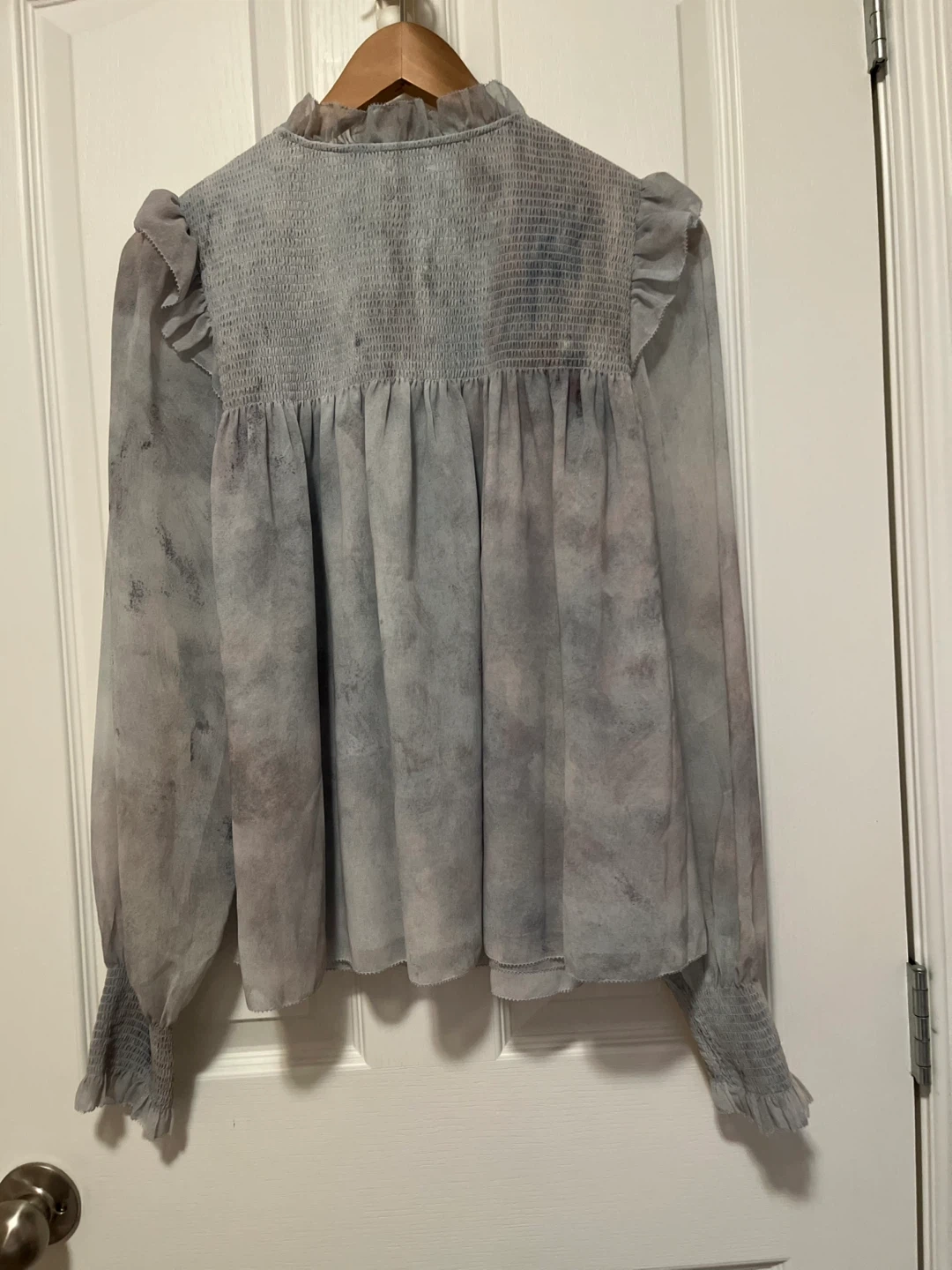 This Wilfred smocked blouse features a tie-neck and ruffled collar. It's made of a sheer fabric with a marbled grey print. The cuffs and bodice are elasticized for a comfortable fit.