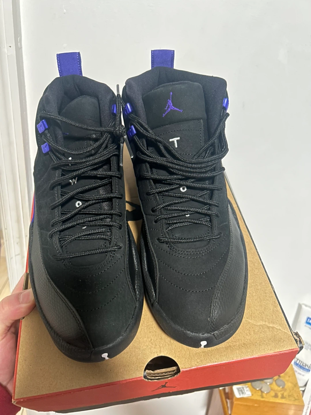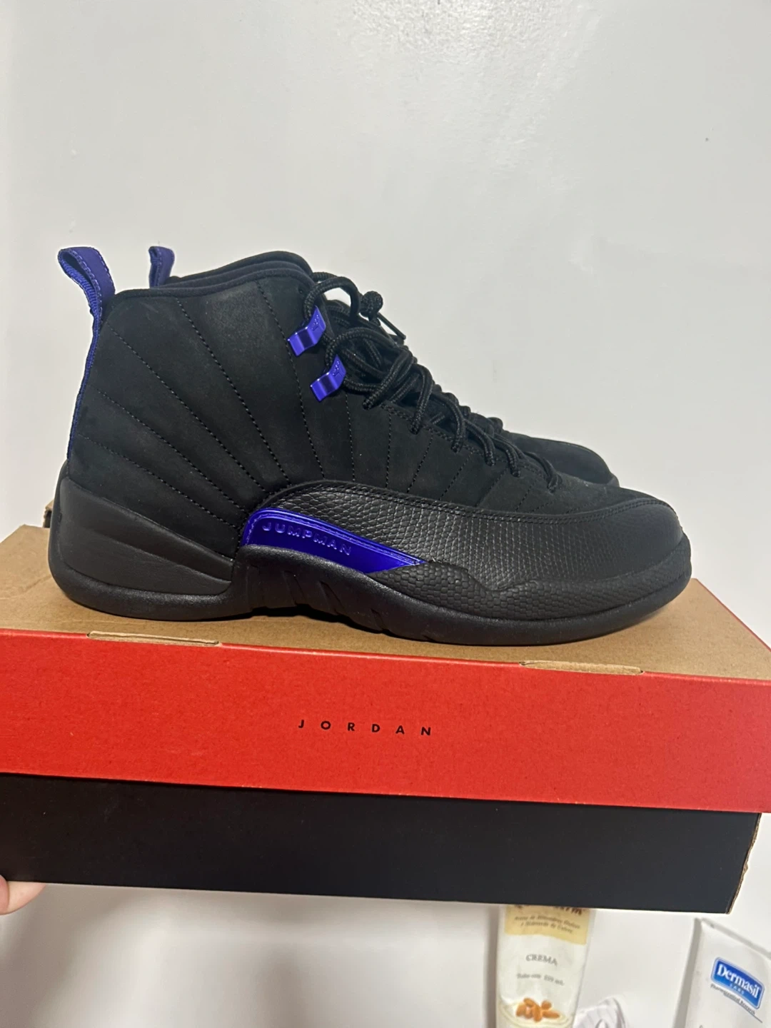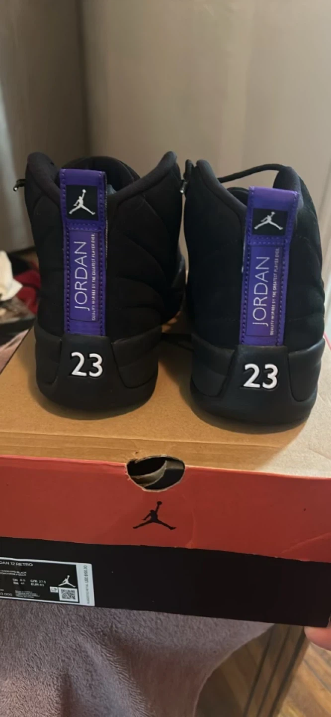 Up for grabs are a pair of Air Jordan 12 Retro sneakers in the "Field Purple" colorway. These kicks feature a black suede and leather upper with vibrant purple accents. The iconic "23" is clearly visible on the heel. Comes with the original Jordan box. Perfect for collectors or anyone looking to add a statement piece to their footwear collection!