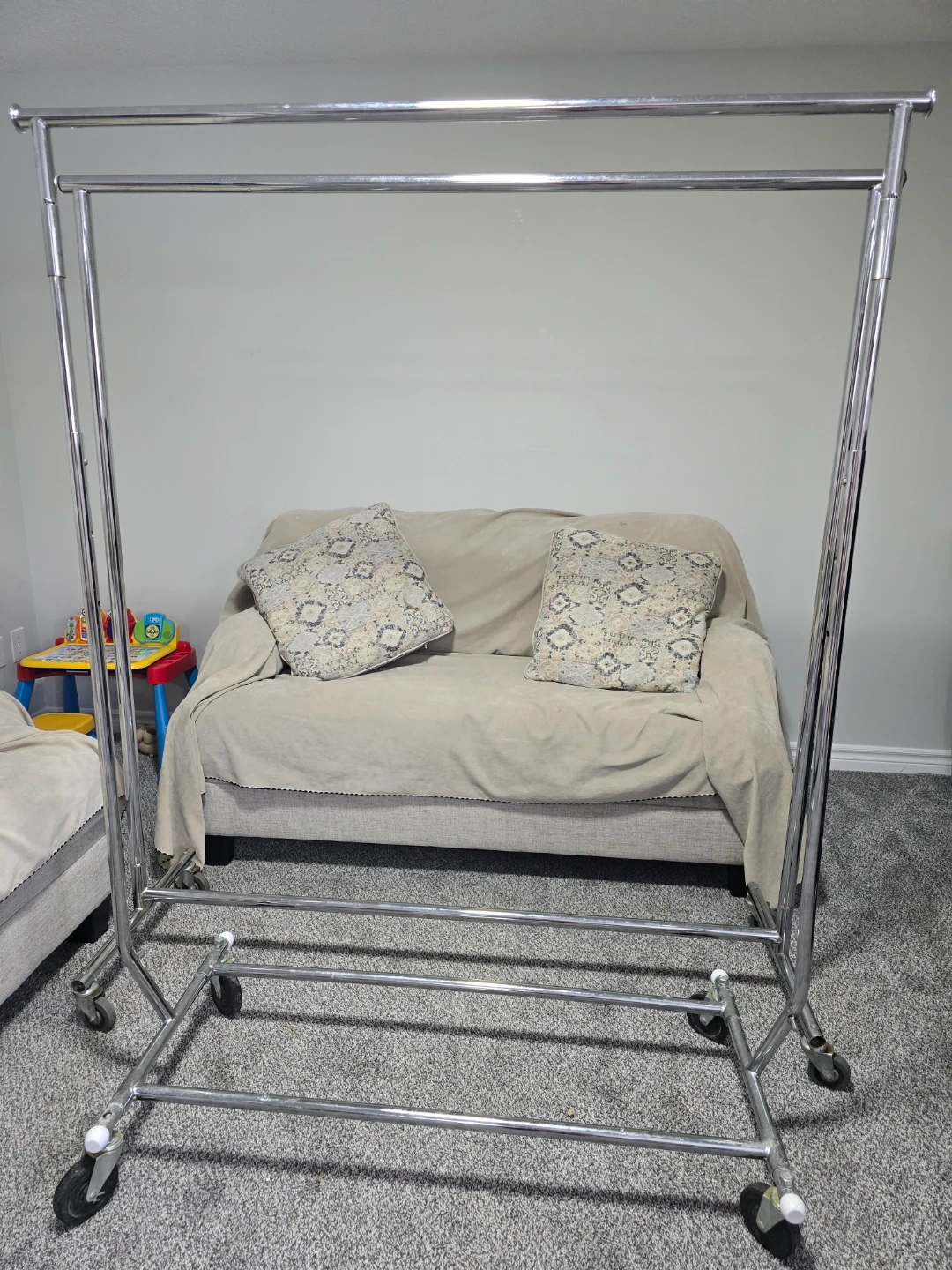 Sturdy rolling garment rack. Made of chrome-plated steel. It has wheels for easy mobility. Great for organizing clothes!