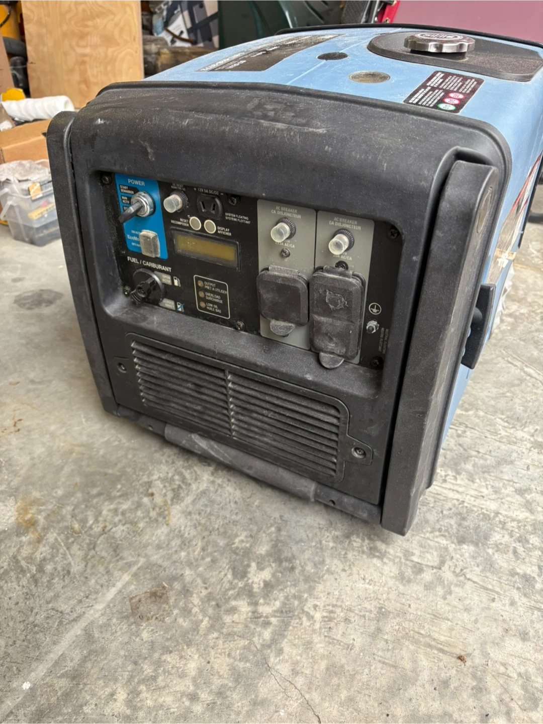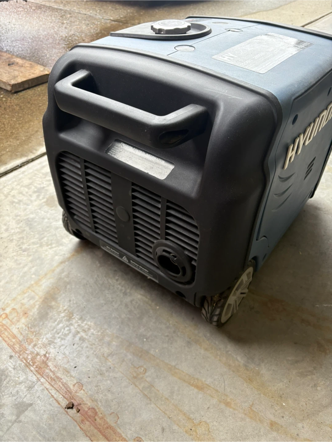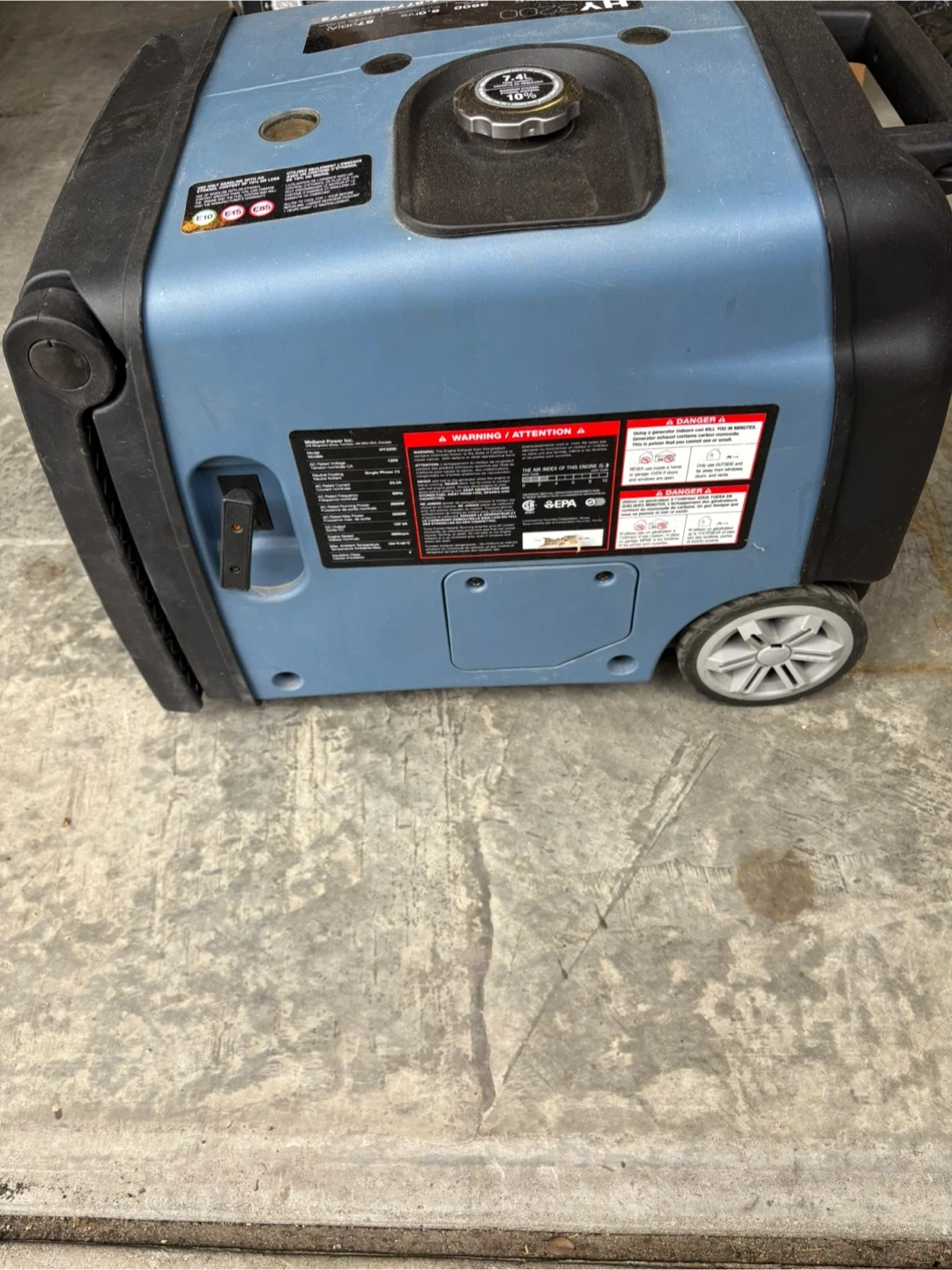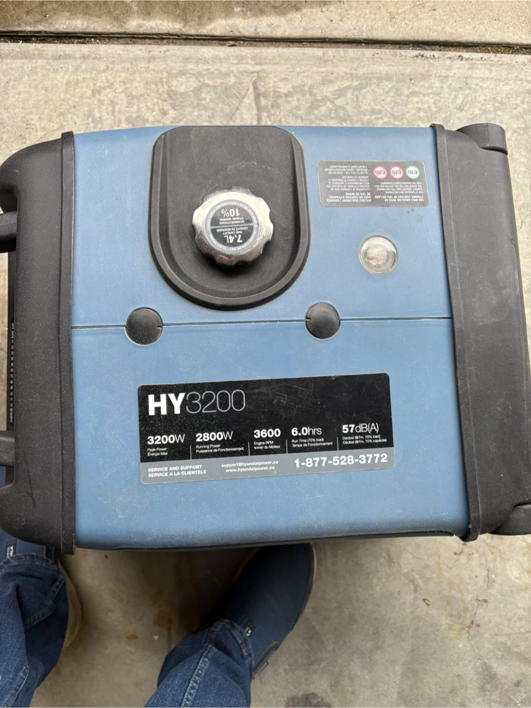 This Hyundai HY3200 inverter generator offers 3200W peak power and 2800W running power. It runs for 6.0 hours at half load with a 7.4L fuel tank capacity. The noise level is 57dB(A). It includes an outlet panel and wheels for portability.
