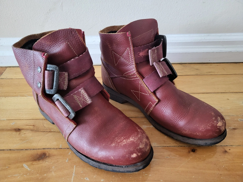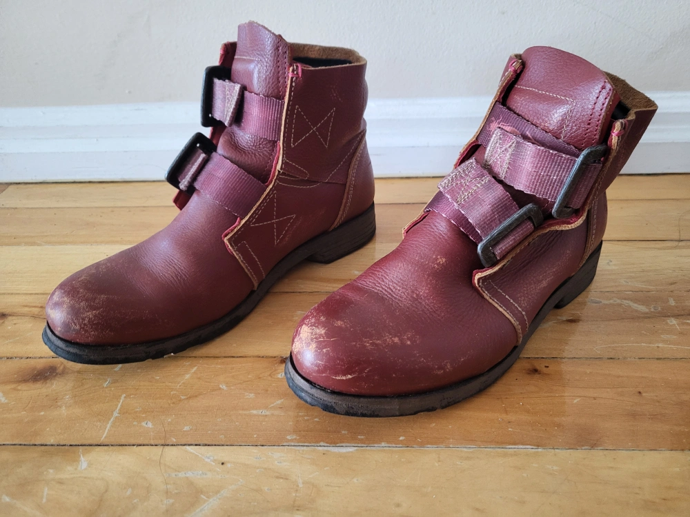 These are almost new, and have been sitting in the back of the closet, see pictures for details. Distressed look is intentional. Extremely high quality leather with unique adjustable straps and built in ankle padding. UK flag stamped into the grip design on the bottom.