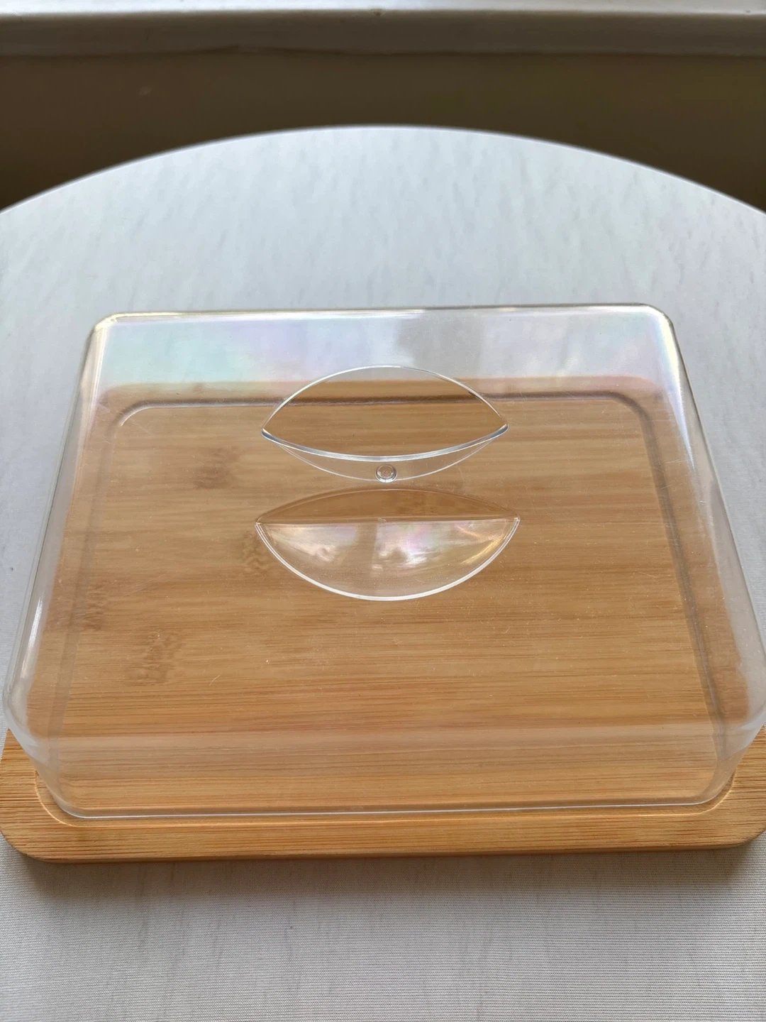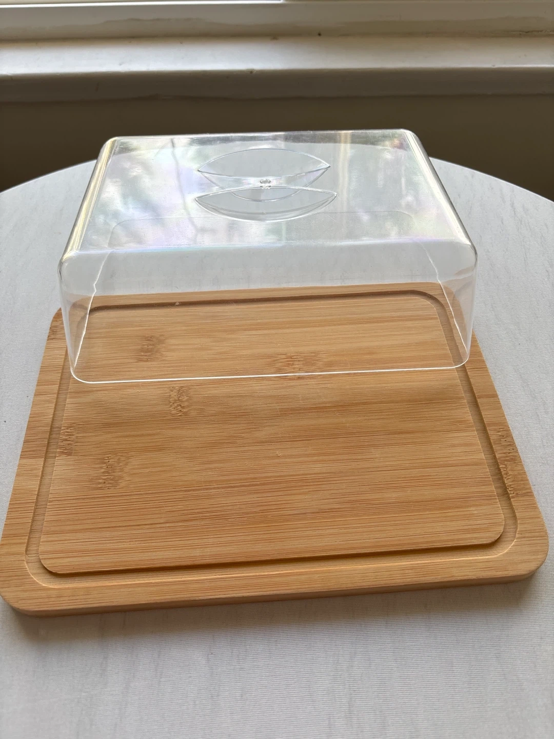 This cheese board features a natural bamboo base with a clear plastic dome cover. The cover has a handle for easy lifting. It's perfect for serving and protecting cheeses or other small appetizers. The bamboo material is durable and attractive for any occasion.